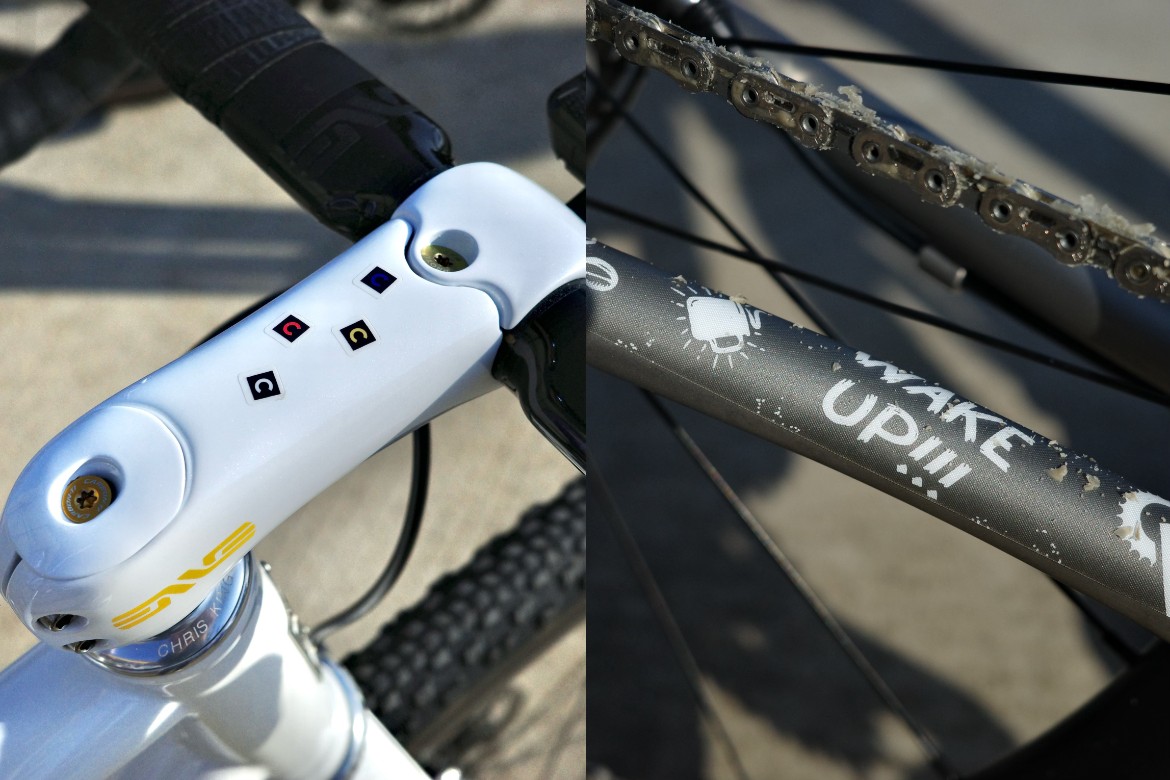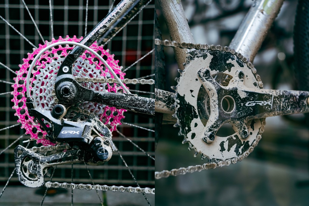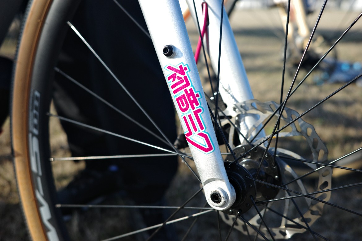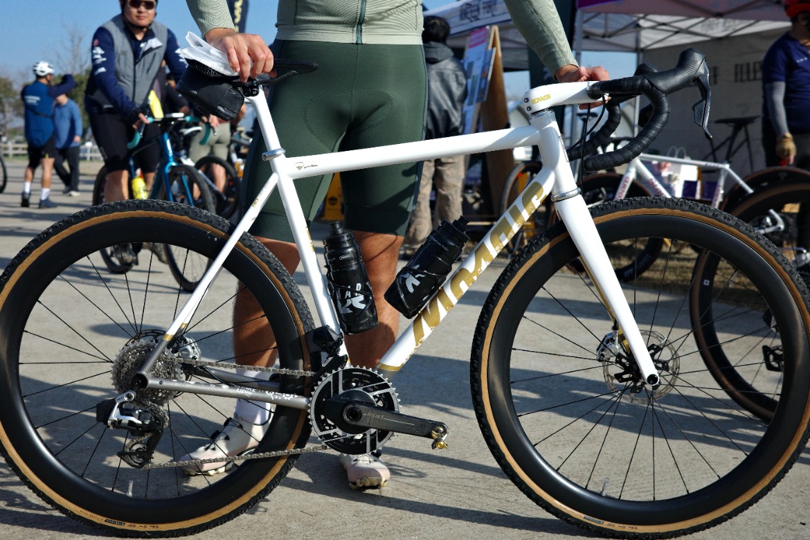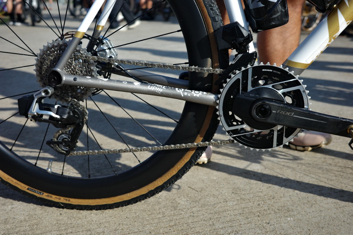 这次赛场出现了各式各样的金属架 Gravel,自然少不了 Standert 的身影。申 Pro 这次骑着 Standert 的铝合金瓜车 Kieswerk 完成了全程的比赛。虽然是金属瓜,但 Kieswerk 支持机械内走,使整车搭配了 GRX 1X 机械套件依旧简洁利落,粉色超大飞轮堪称点睛之笔。Kieswerk在德语里是采砂场的意思,上管的工人形象Lucky cat也与车名含义相呼应。