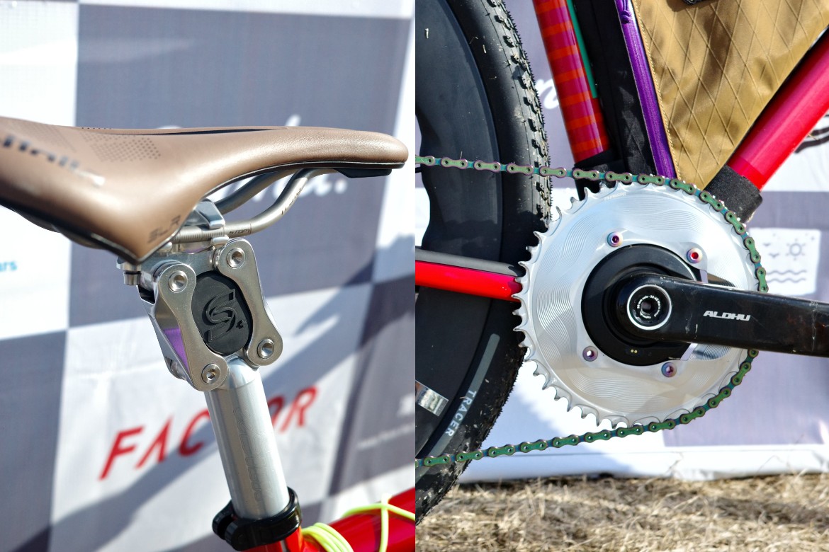 接下来吸引到我的是这台Specialized Crux DSW 。这台车的要素过多,银色的Garbaruk盘片搭配银色的Cane Creek eeSilk避震座管,通过弹性阻尼块和平行四边形结构提供约 20mm 的避震行程。轮组选用了fulclum sharq 57,夸张的造型和这台车的主题非常搭。另外车主更换了平把,搭配了shimano的小休息把。最后塞满整个前三角的储物包和车把上的小铃铛都和这台车完美适配。