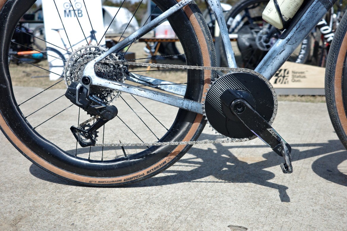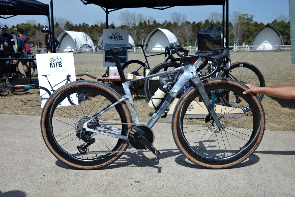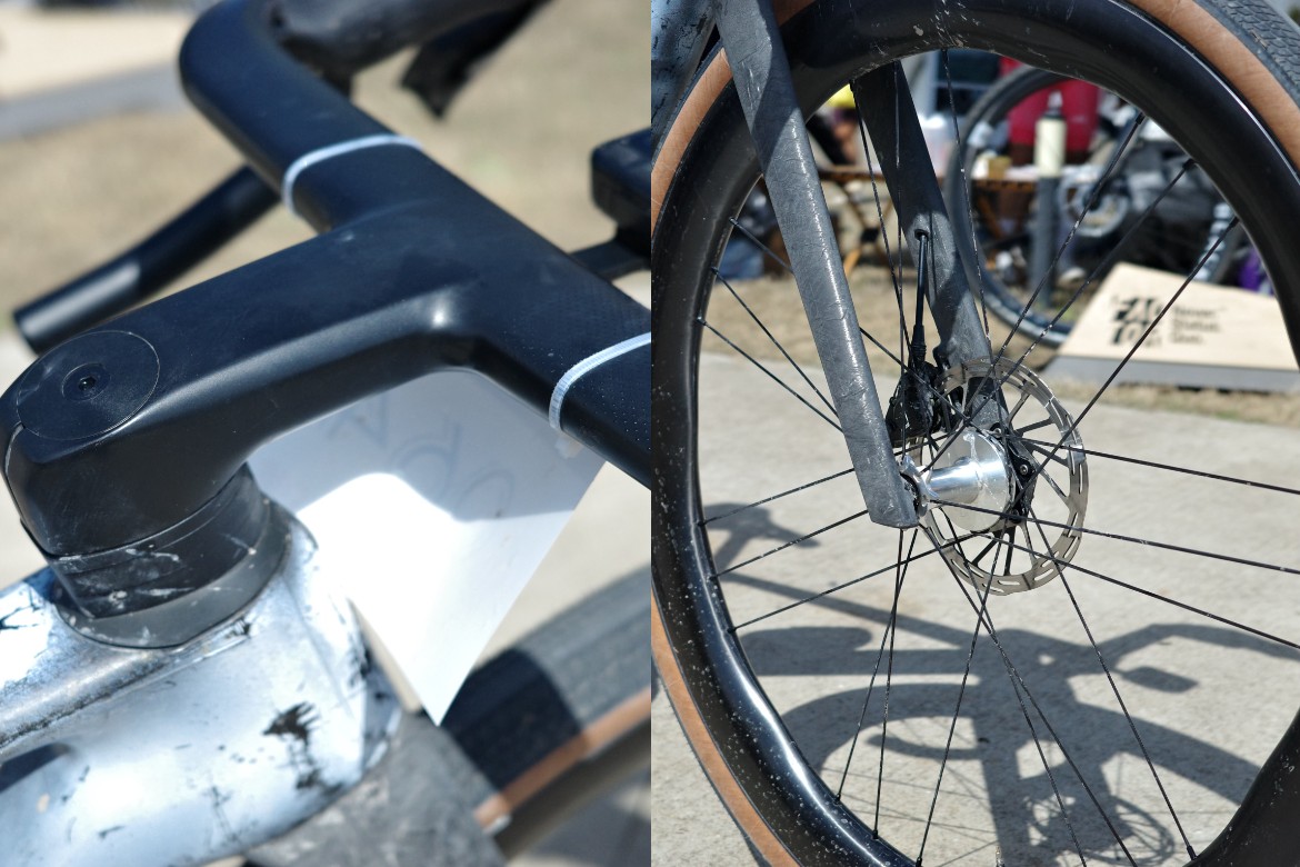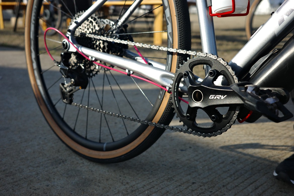 然后是一台毛坯涂装的 Tavelo GROW,这台车处处充满了战斗气息,车手使用了 50T 的超大单盘,搭配公路锁踏。轮组采用的是 Tavelo 旗下的波动力 Sharp GR 瓜轮。车主还搭配了自家新款AVRO-GR一体把,规格是380*110,非常战斗。和工作人员闲聊得知,这是他们的测试车,所以涂装还没有准备好。