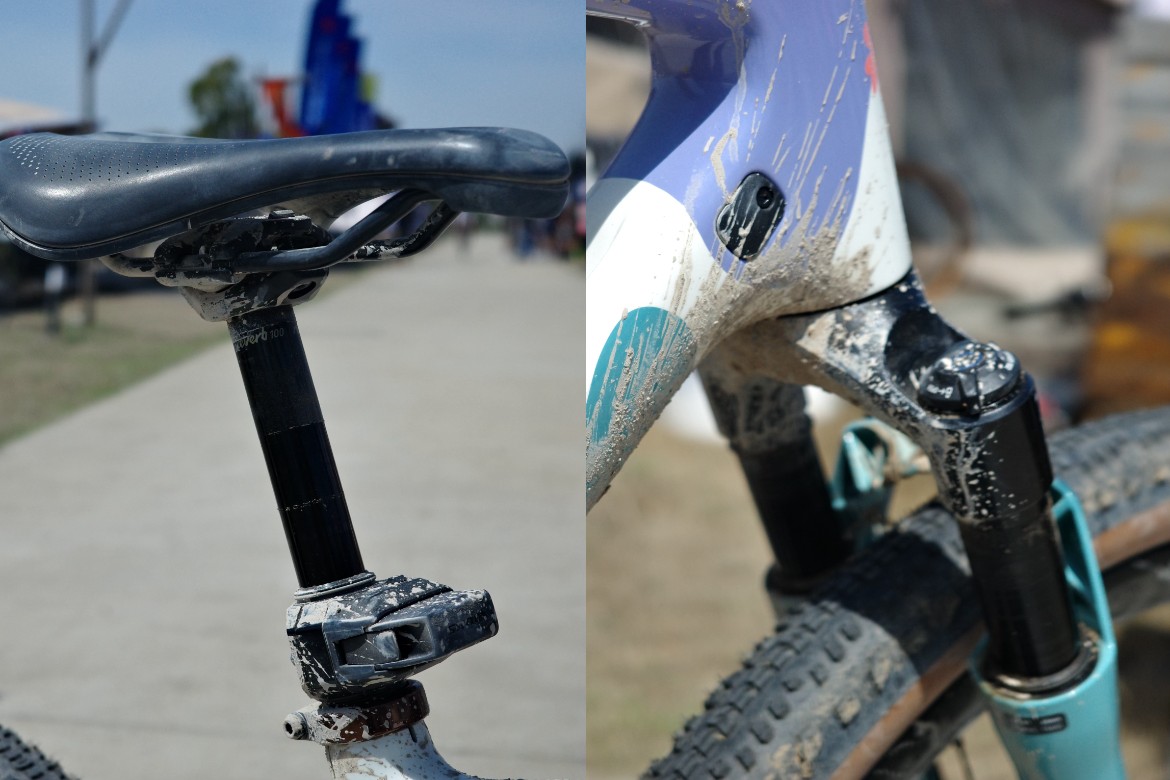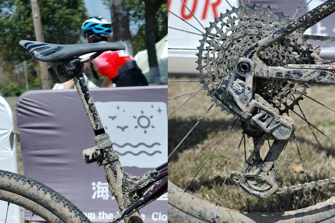 当然,并不是只有昂贵的车才能应付GUAVEL100的赛道。河海大学的李同学的车让我们看到了年轻人的热爱。车架用的是 TQIQT 的钢架瓜,套件选用蓝图 + 博力为国产组合,车架上的吉伊卡哇贴纸与亚克力徽章,满是青春气息。最有意思的是头管内集成组合工具,堪比 C68 的设计,小哥还在路上帮其他车手紧固了坐垫。