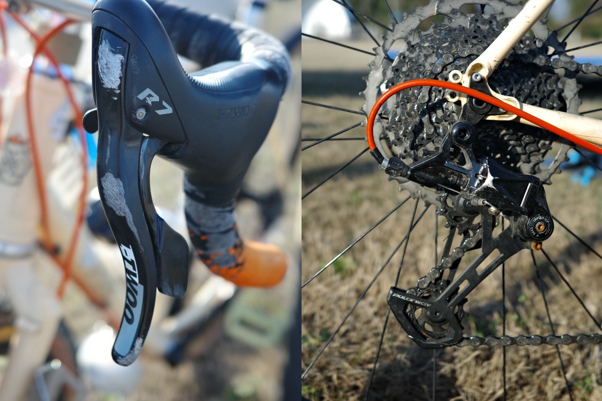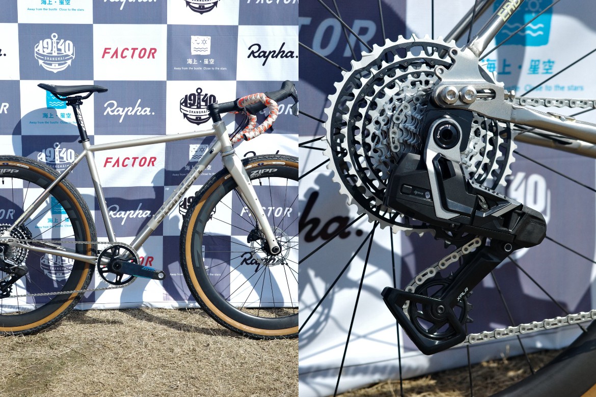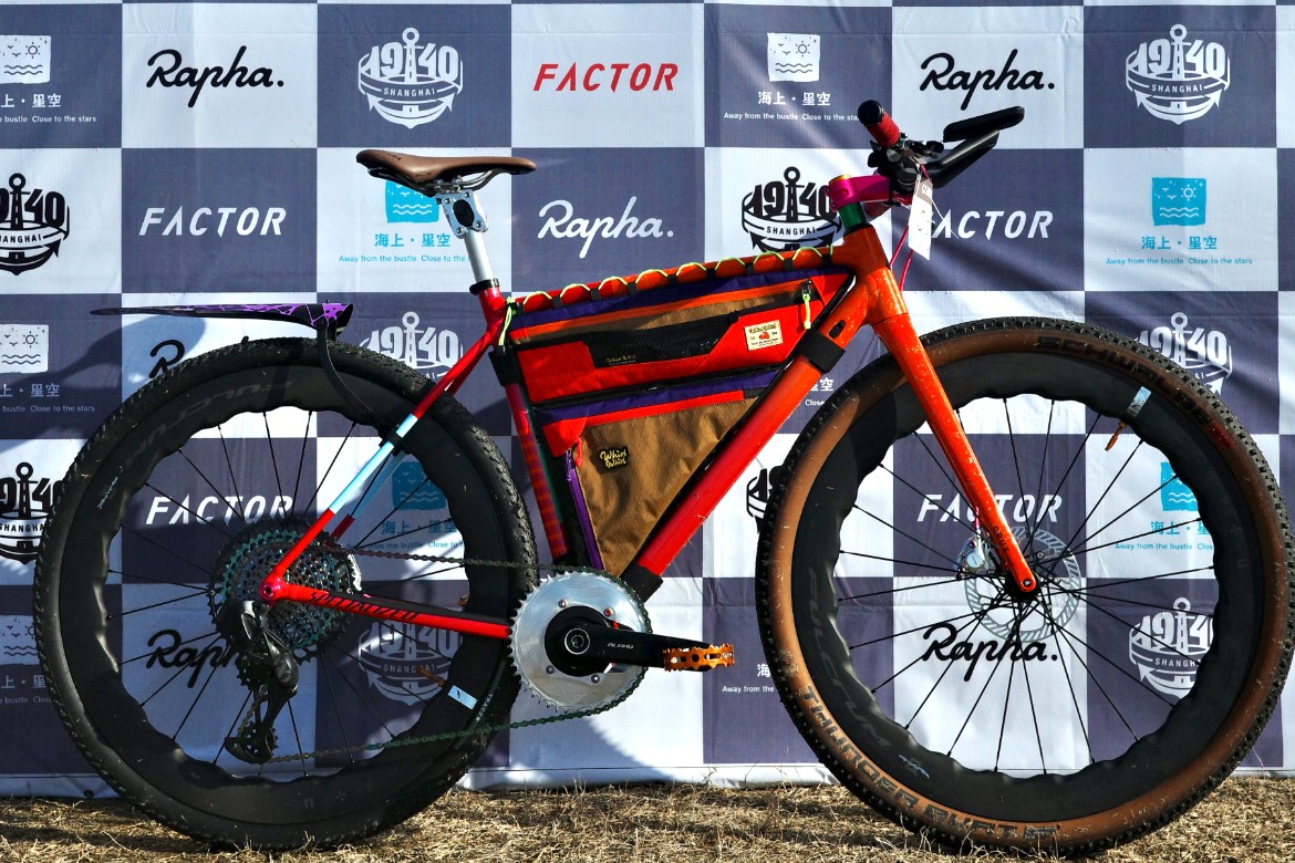 这台 Mosaic GT-1 是第二次出现在崇明GUAVEL的赛场上了。这个来自美国的手工钛架品牌,以极致做工、精准定制、经典耐用著称。车主使用了非常狂野的公路变速系统和齿比选择,以此表达对赛事难度的轻视。另外,车主搭配了车架同色的 ENVE 把立,通过把立的贴图我们可以推测出车主应该是学 C 语言的。