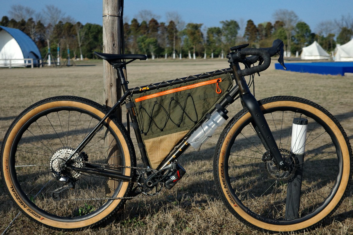 来自“滚瓜”的江河这次带到崇明赛道的是一台来自澳洲的 CURVE GMX+,这是一台钢架旅行车,最大亮点莫过于换装29寸山地轮组,搭配2.25寸宽胎。超短把立+超宽的外撇车把,让这台车的操控更灵活舒适。因为在前三角位置塞满了储物包,所以水壶就安装在了下管两侧,就像2枚火箭一样随时准备发射。