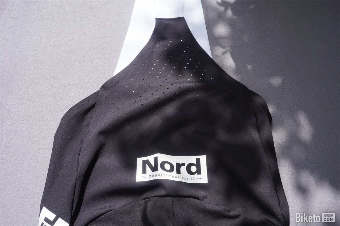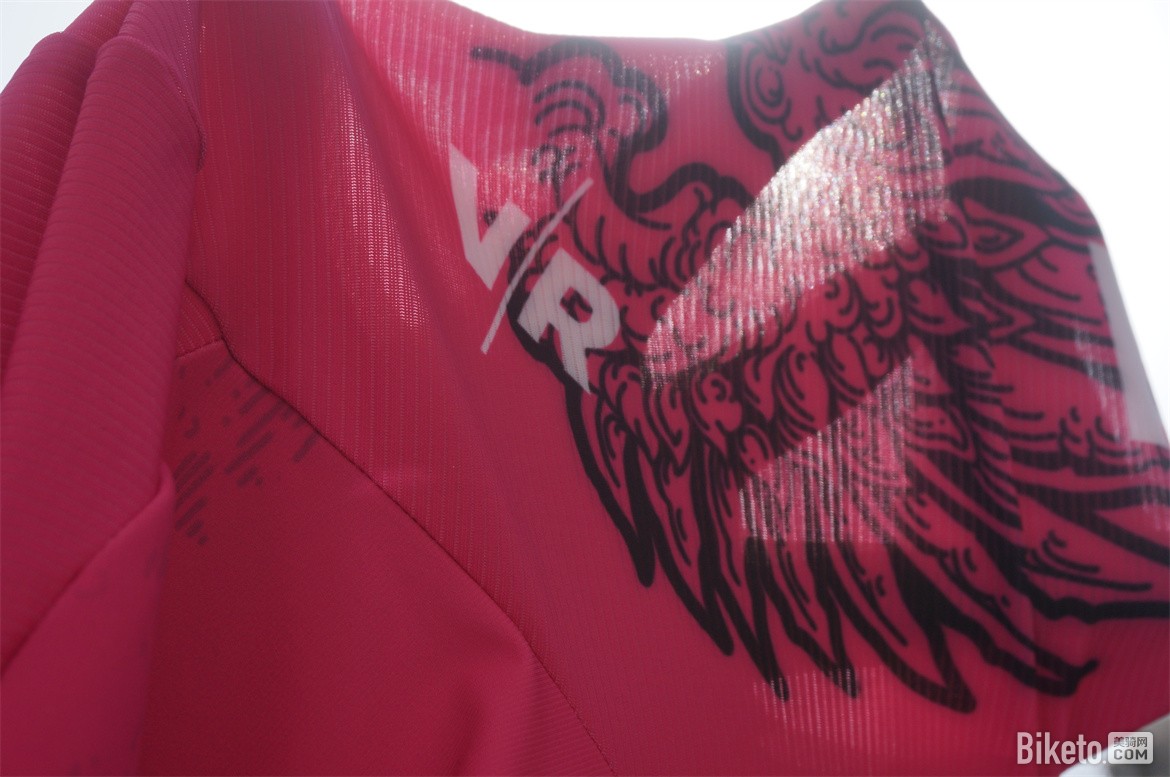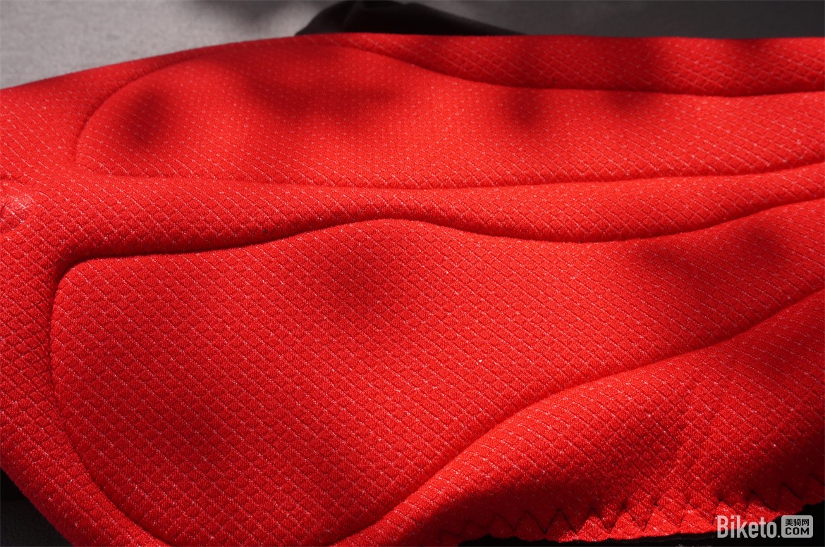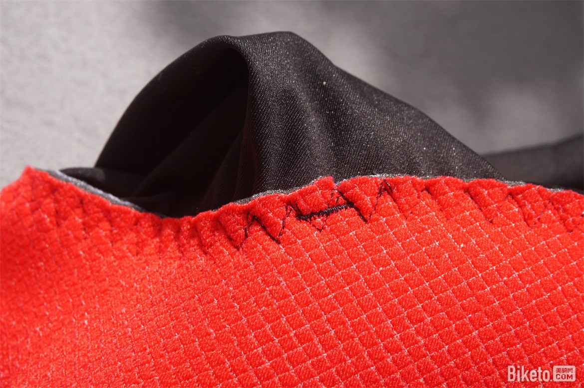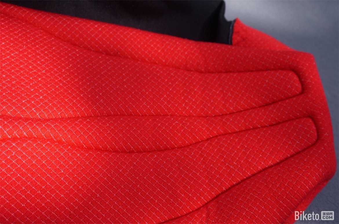 肩膀以及后背部位使用的轻薄网孔面料舒适度很高,轻薄贴合。骑行过程中这部分属于撞风面,能够很好的带走身体的热量。肩膀的缝线合理的避开了肩峰骨头的部分,即使激烈的摇车动作也不会有摩擦皮肤的现象。