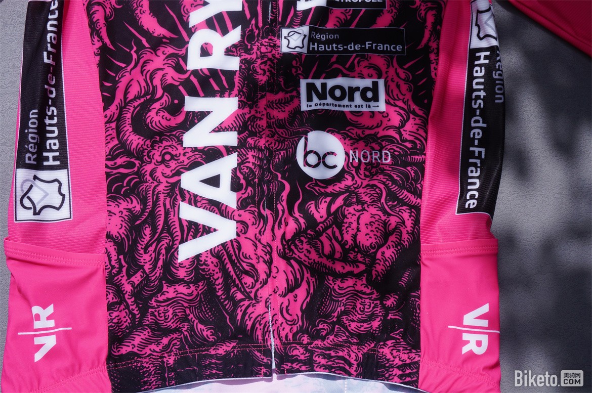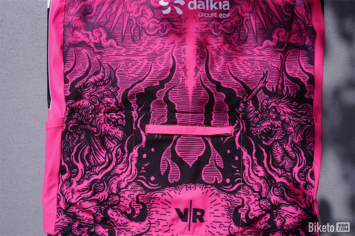 背面的印花看上去就像是充满荆棘的地狱之路一般,正如同每天最为艰苦的春季古典赛巴黎鲁贝。每个参赛的车手都是一个要战胜恶魔的天使。配合白色的车队LOGO非常好看。