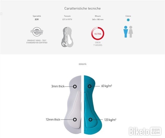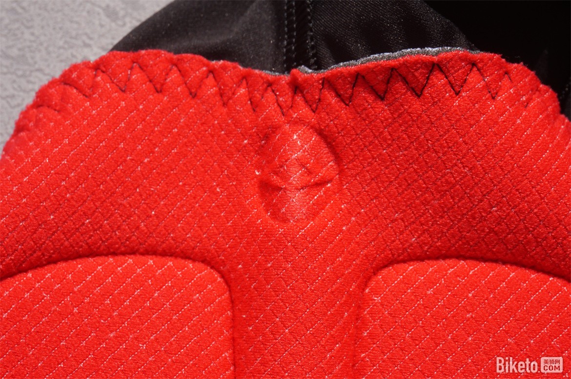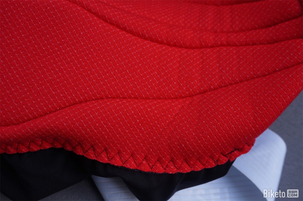 裤垫使用了3mm厚度的60 kg/m3 聚氨酯海绵打底,上面附加了一层12mm厚度的120 kg/m3 聚氨酯冲孔海绵进行支撑。在双箭头的官方分类当中属于支持超过7小时骑行的最高级别。