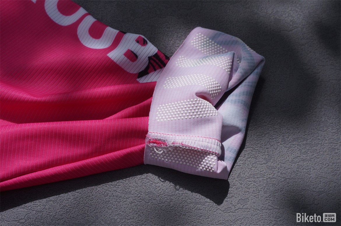 袖口部位的防滑点能够帮助袖口固定在皮肤上,即使大量出汗也不会出现滑动或者是防滑点刺激皮肤的现象。不过材料的原因袖口会出现向内卷边的现象,穿着时需要花时间调整抚平。
