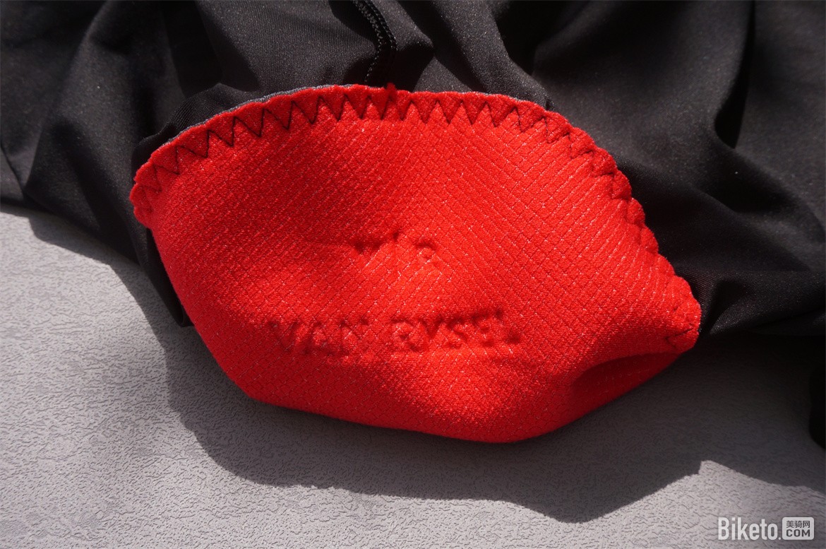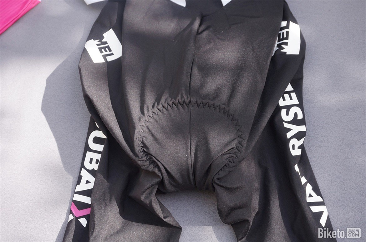 后腰部位是一整块面料,和腿部拼接的缝线位置也处于不太活动的位置,不会在踩踏时造成摩擦。后腰容易堆汗的位置使用激光打孔来增加透气性。后腰上最主要的广告位居然不是VR,看来这个赞助商对车队来说至关重要,不过这个LOGO在骑行中会被上衣遮住。