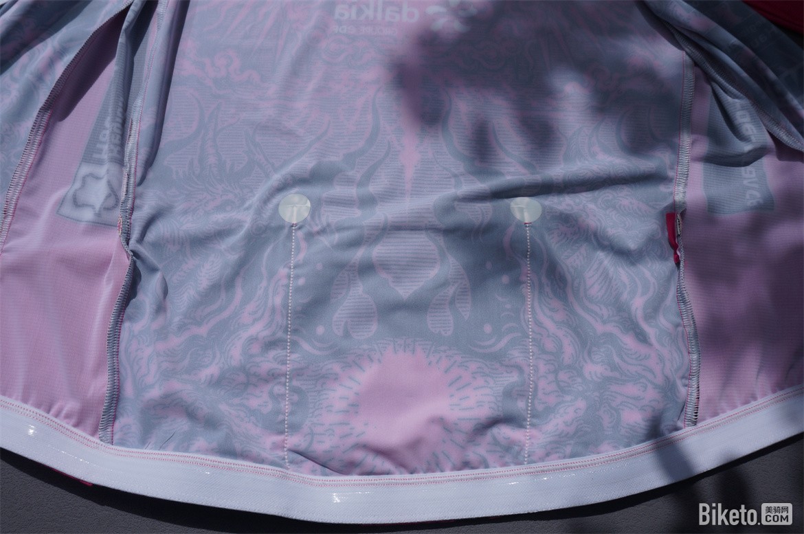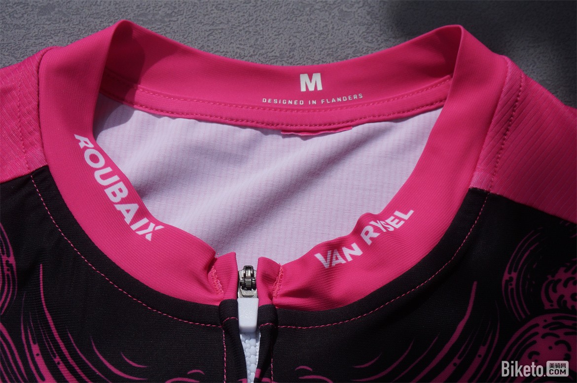 领口是现在很流行的小立领设计,前端稍高些,后侧为了适应骑行的抬头姿势做的稍低。领口处的洗标采用了和骑行服相同的一小块面料单独缝制方便用户剪掉,残留的部分也不会对皮肤产生刺激,尺码标签使用了无感印刷的方式。