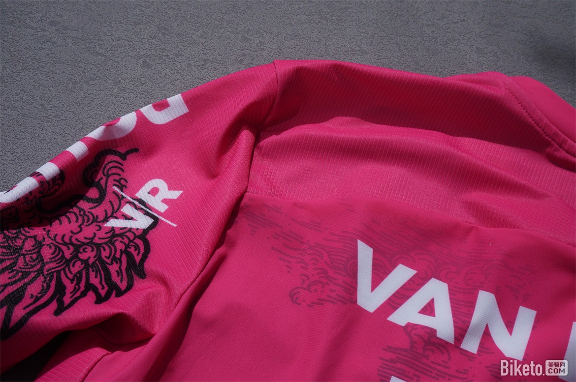 肩膀位置使用了圆肩设计,接缝位置避过了肩峰以减少摩擦。袖子的部分前短后长,有明显的配合骑行姿势的前倾立体剪裁。