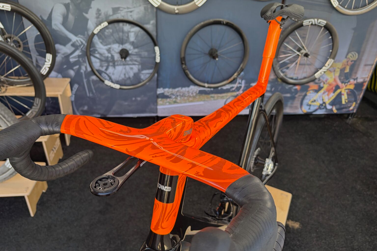 它有点类似于本文开头那辆浸染的 ENVE 自行车。其中一个更精致的细节是金箔头标,在阳光下有着很酷的质感和光泽。