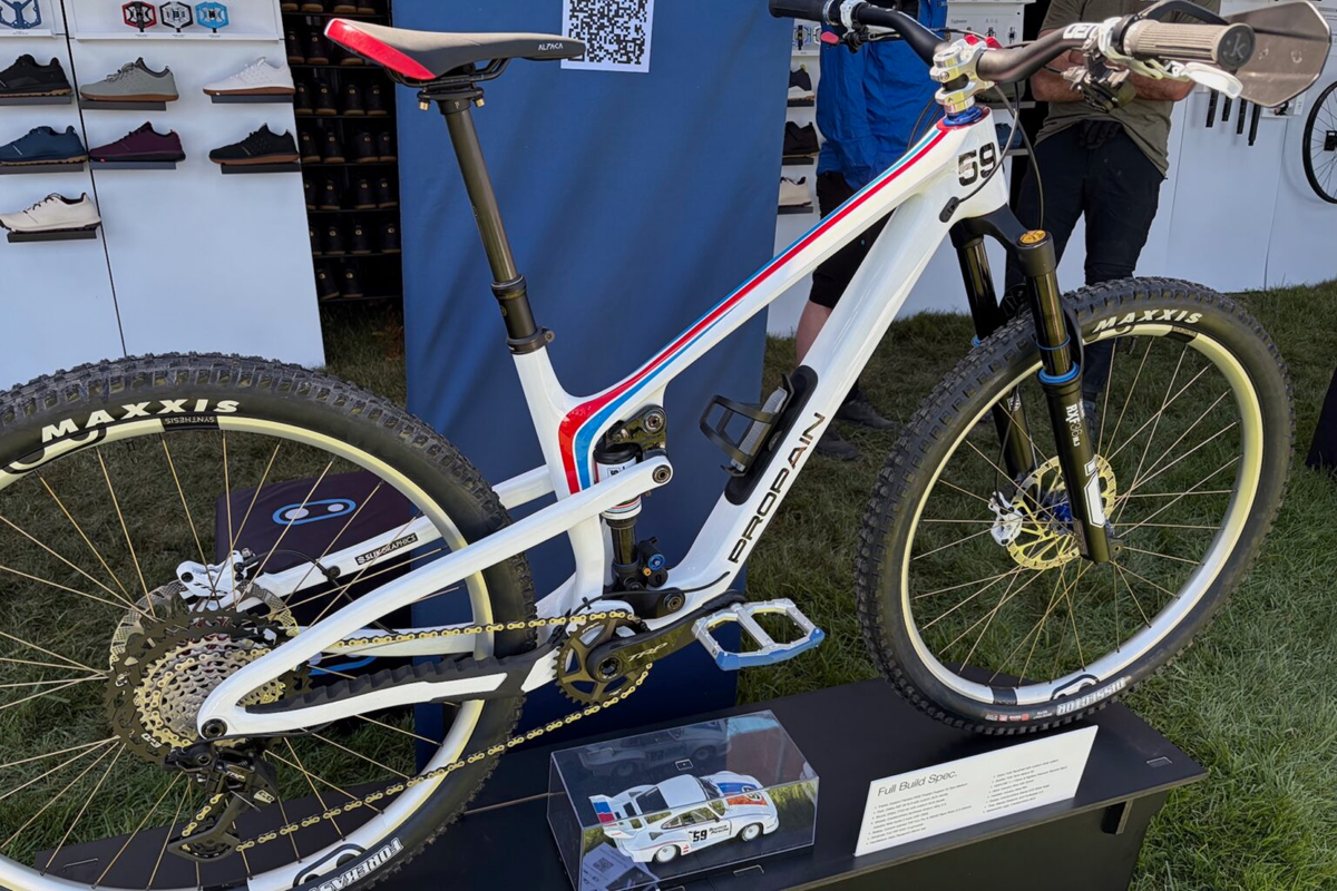 这辆花哨的 Propain 与透明盒子里那辆迷你保时捷相匹配。他们完美地完成了涂装,并精准地搭配了各种点缀,使整体浑然一体。这辆车展示了全新的 Stamp Evo 脚踏(带蓝色复合护板)以及该品牌的银色 Synthesis 轮组。得益于 Crankbrothers 和其他几个品牌,银色轮组正在回归潮流。