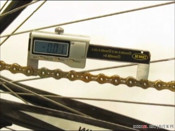 先将卡规往右压紧,并按下归零键,再卡在链条中间,读取卡规检测链条的结果,若量测数据小于0.4,则表示链条良好,未达更换程度,当数据大于0.8时过度磨损,需更换链条。
