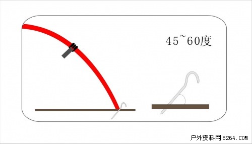 今天图解几个帐篷使用的小窍门,一部分先给大家看。钆帐钉时,不要90度角下钉,帐钉应该和帐杆成直角的角度,才会有最大的固定阻力。所以一般是与地面45-60度角来下钉的。