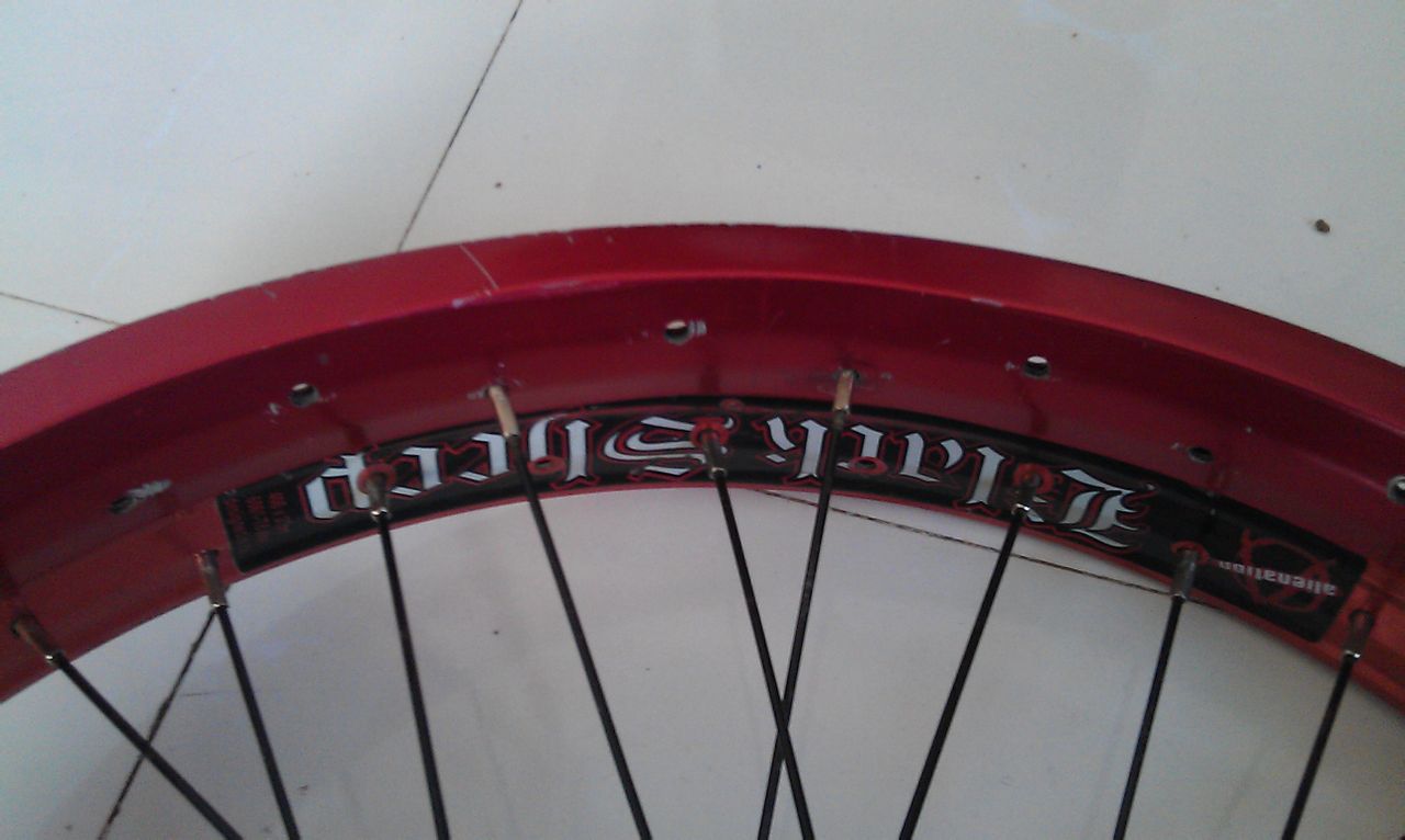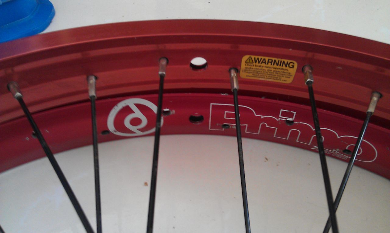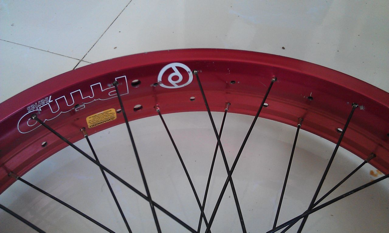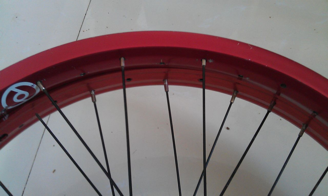 注意:关键要把辐条放到新圈上对应的辐条孔里面,然后把辐条帽拧上,下图中可以看见有两根辐条已经到新圈里面了。