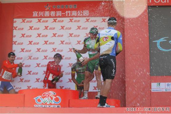 选手们兴奋的互相喷香槟,观看的民众也一起高声欢呼鼓掌