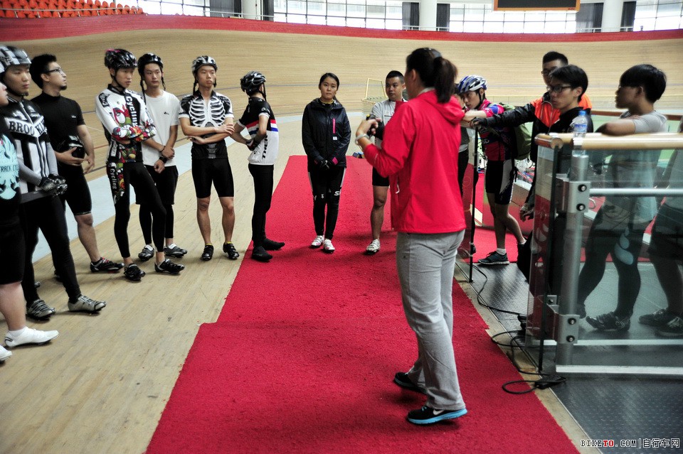 现场各位都认真听着教练的指导,小编在旁也认真地学习,发现场地自行车真的有很多要注意的地方,不然,场地自行车也是极度容易受伤的,教练就指着一个弯道说,那里就是最多运动员摔伤的地方。小编也对此印象深刻,亚运会中,国家队的张磊和香港队的黄蕴瑶都在弯道上摔车受伤过