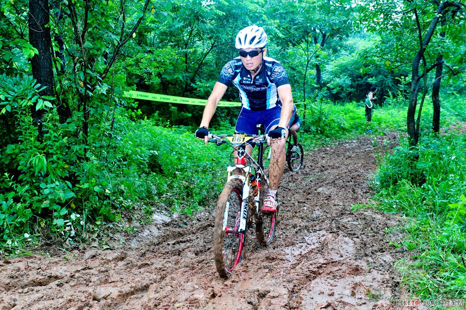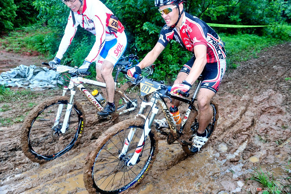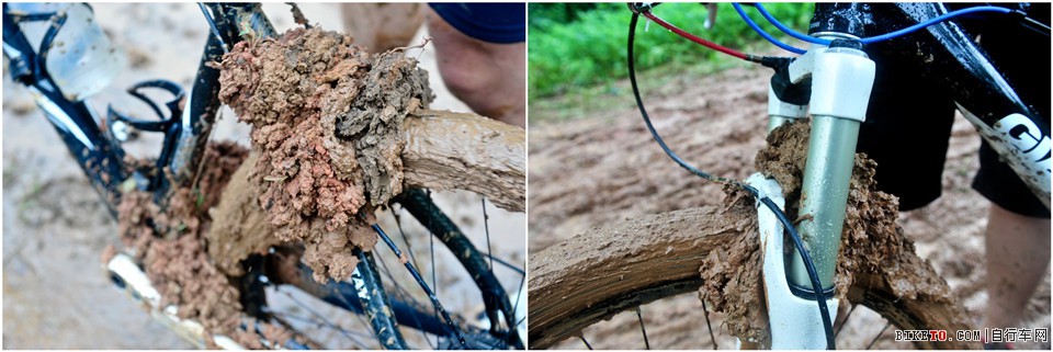 泥泞的赛道对轮胎及前后叉的排泥性能提出了高要求,不少参赛者的车子通过这段路后已经完全骑不动了