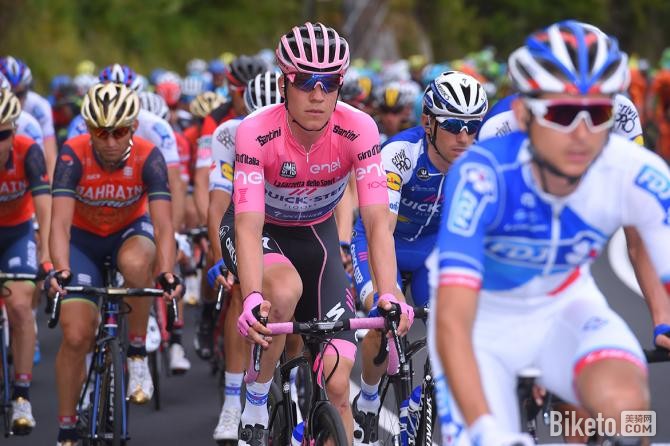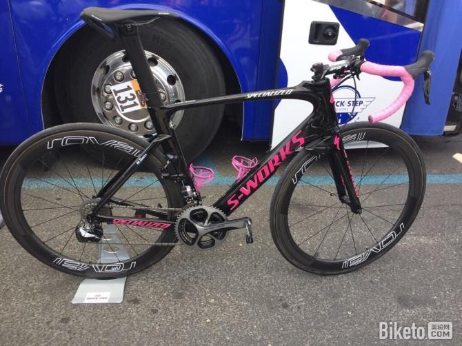 粉头盔、粉衫、粉手套、粉车,从环意第二赛段开始,荣哥骑着装备Shimano Dura-Ace 9150 电变套件的Specialized Venge ViAS。而在埃特纳火山赛段,荣哥换了环罗曼蒂的Tarmac战车,重新夺回粉衫后又换成粉Venge(有赞助车真任性啊),在后面的山地赛段估计又要换成更轻的Tarmac(Venge确实重……)