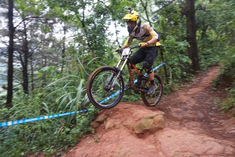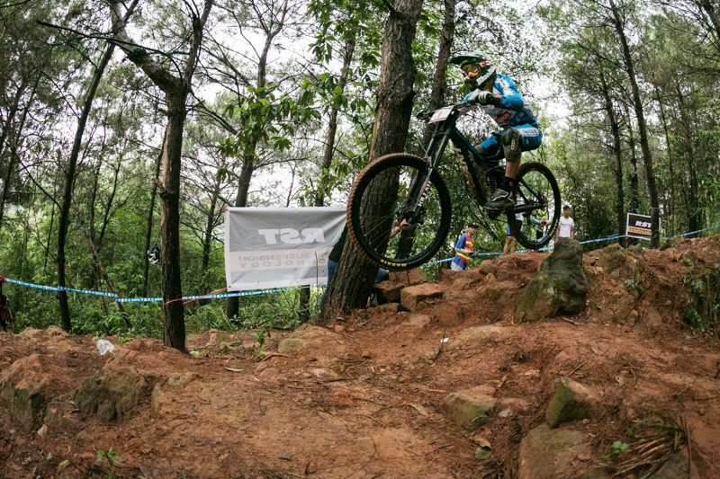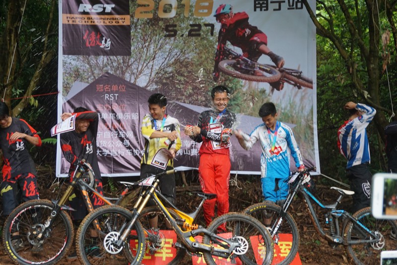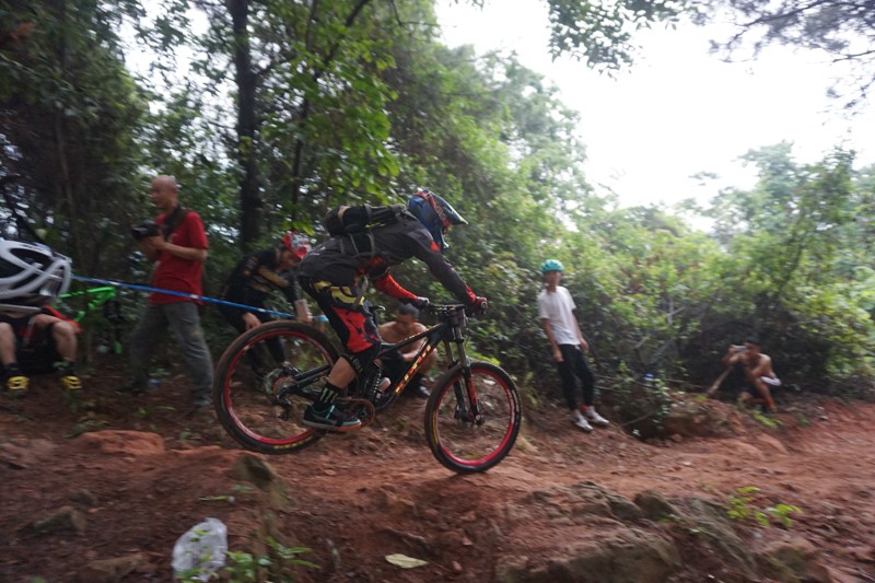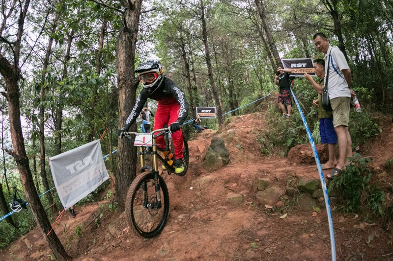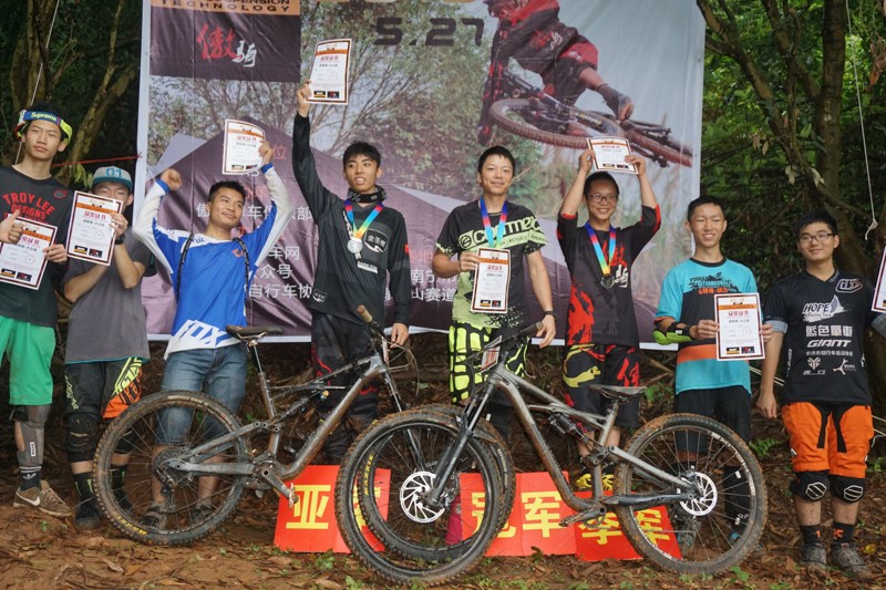 亚军8号廖学艺,柳州道卡斯。跑去骑越野摩托车之后就很久没见他了,这次像半路杀出来的程咬金。来以为他这么久不骑单车肯定技艺生疏,不料在练习时就有表现出色的状态,正赛一鼓作气拿下第二名,只比第一名慢了0.13秒,多骑越野摩托对速降可能真的有加成。