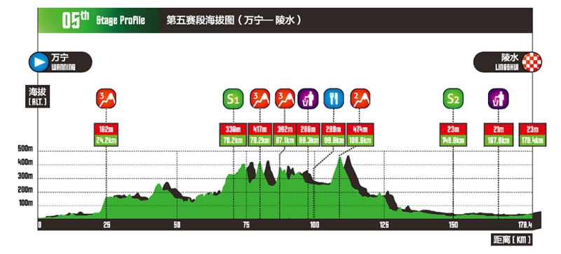 赛段中的3个主要爬坡点集中在赛段中段的30公里,均属于吊罗岭。这也给突围车手很大的机会,争取赛段冠军甚至总成绩领骑衫。若要争胜,108.6公里的二级爬坡和随后的下坡将会是关键。但是冲刺手在这个赛段依然有机会,因为后半段以平路为主,大约距离终点有50公里的平路。倘若大集团齐心,突围车手想一走高飞并不是易事。