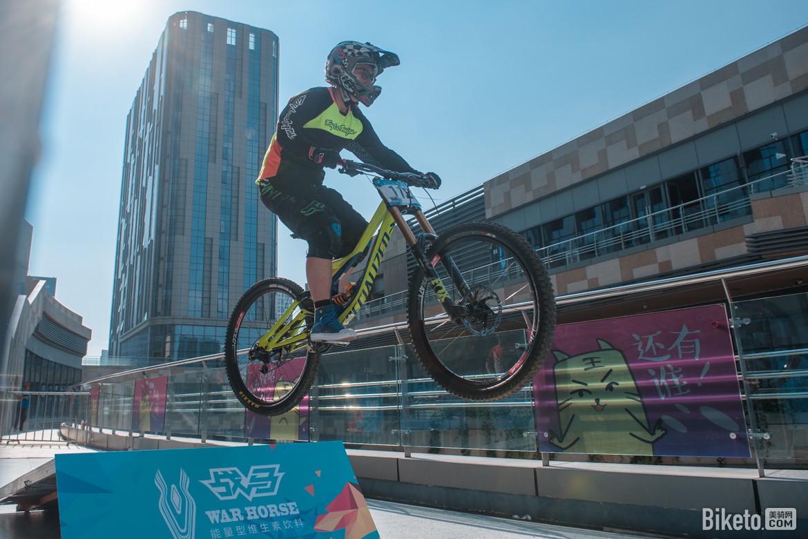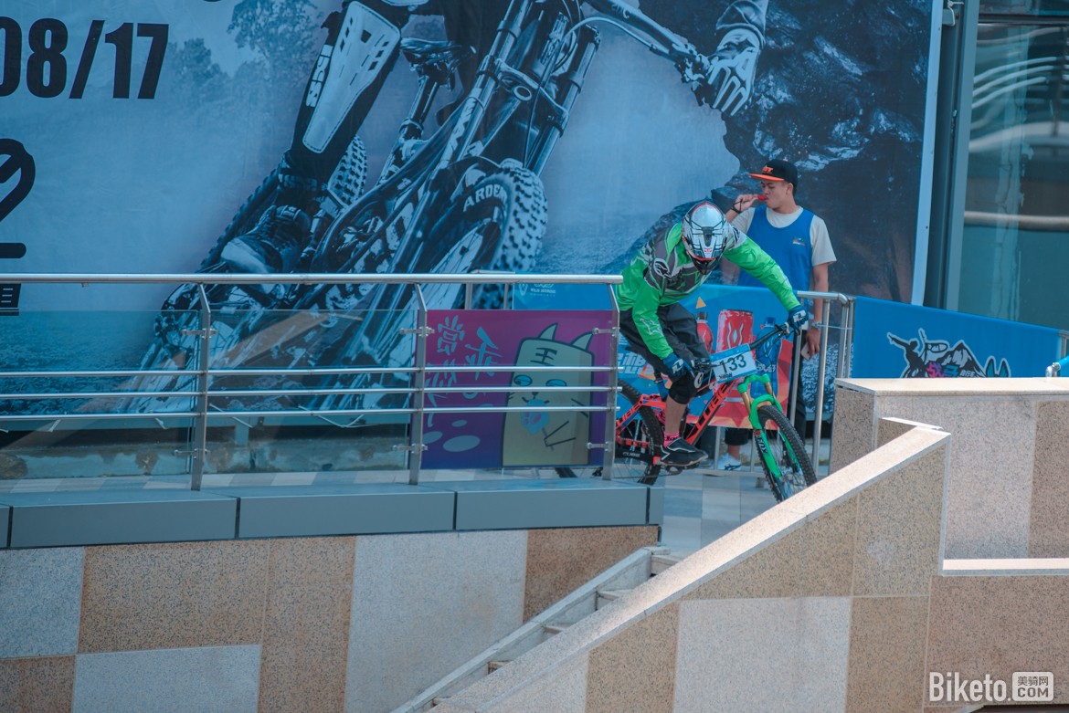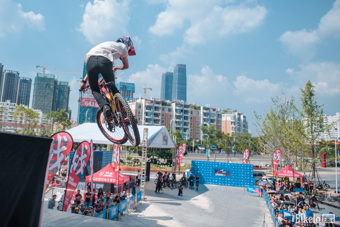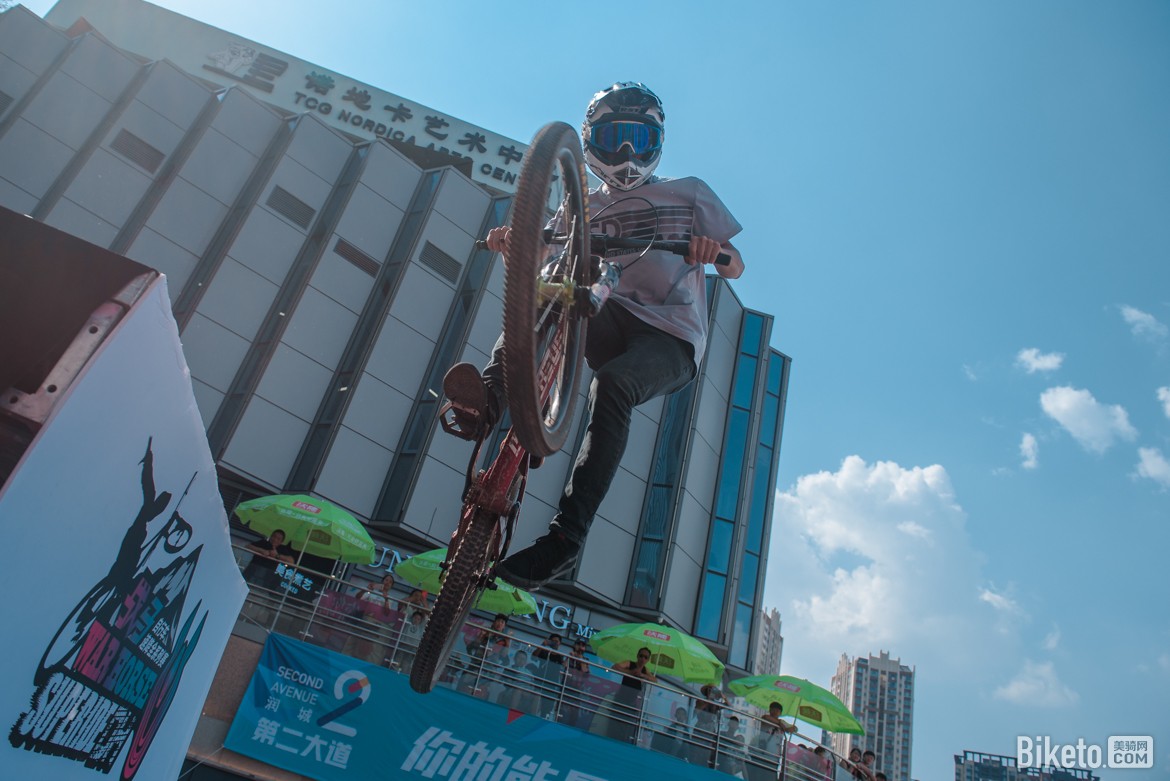 下午最后一轮试骑赛道过后,开始进行比赛的第一个项目,甩尾赛。选手需飞下跳台作出甩尾的动作去赢得观众的欢呼和主持人手中的现金奖励,幅度和难度越大奖金越高,于是在润城·第二大道的广场上飞过了一道道酷炫的身影。