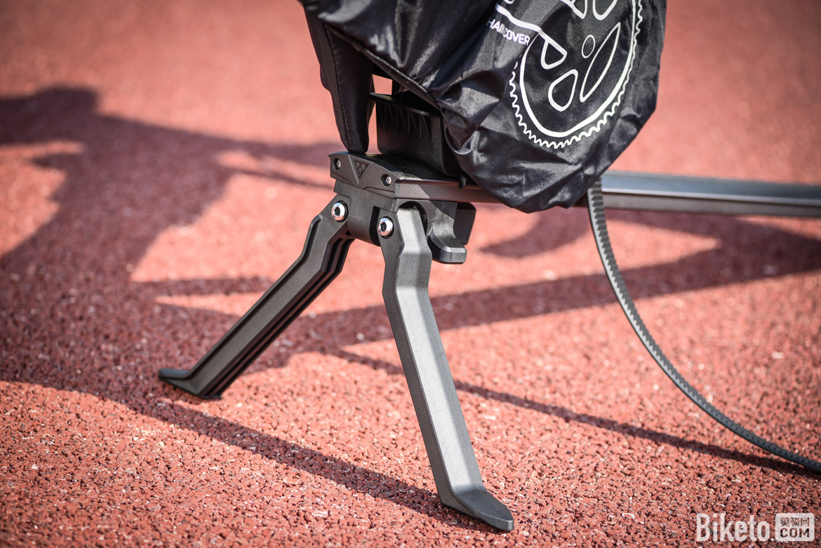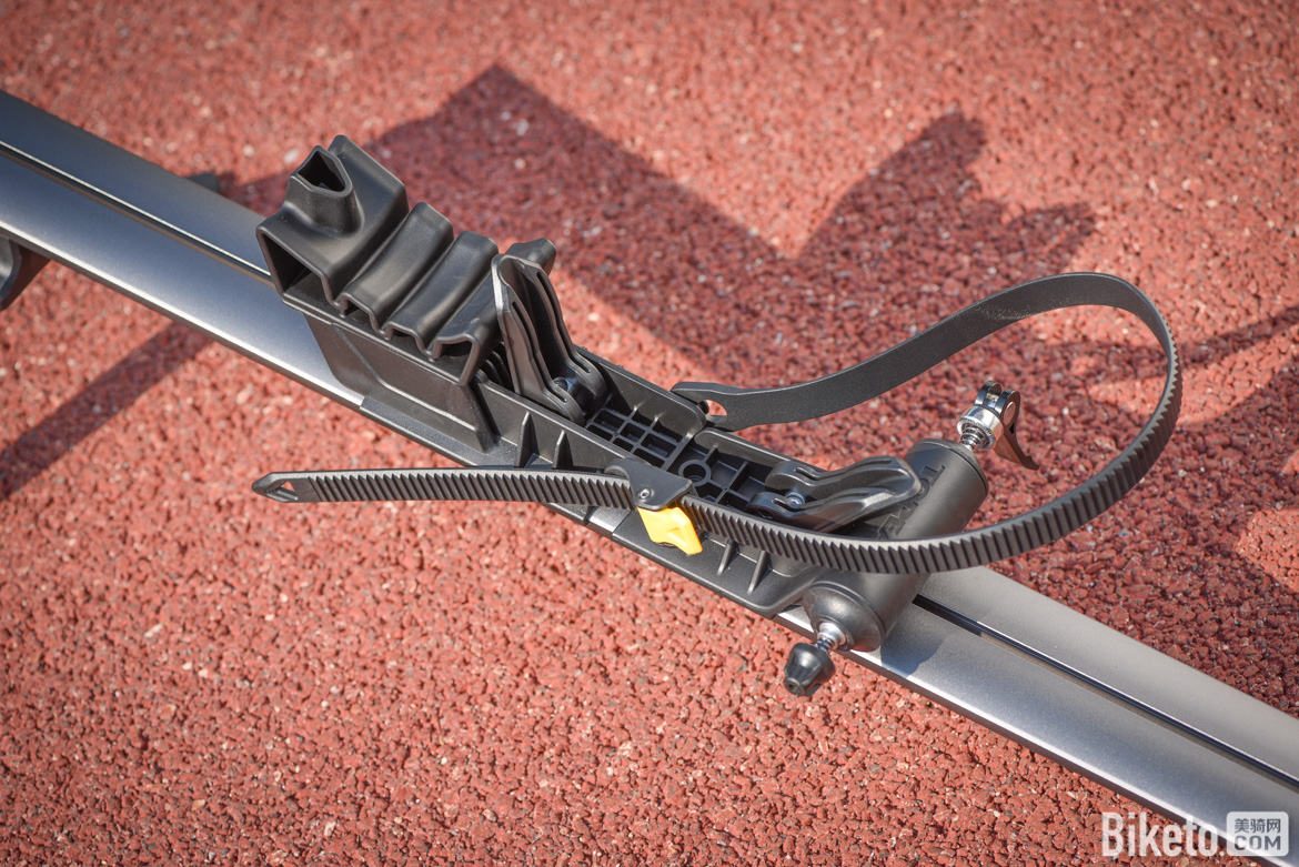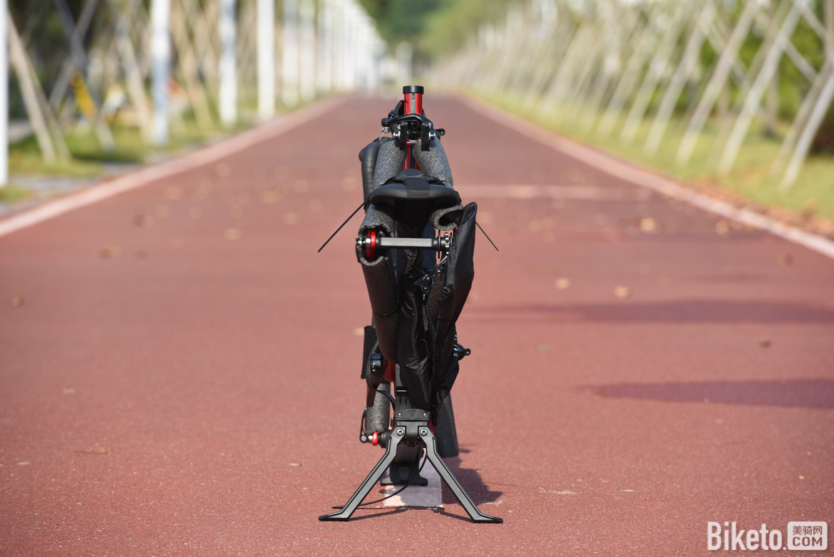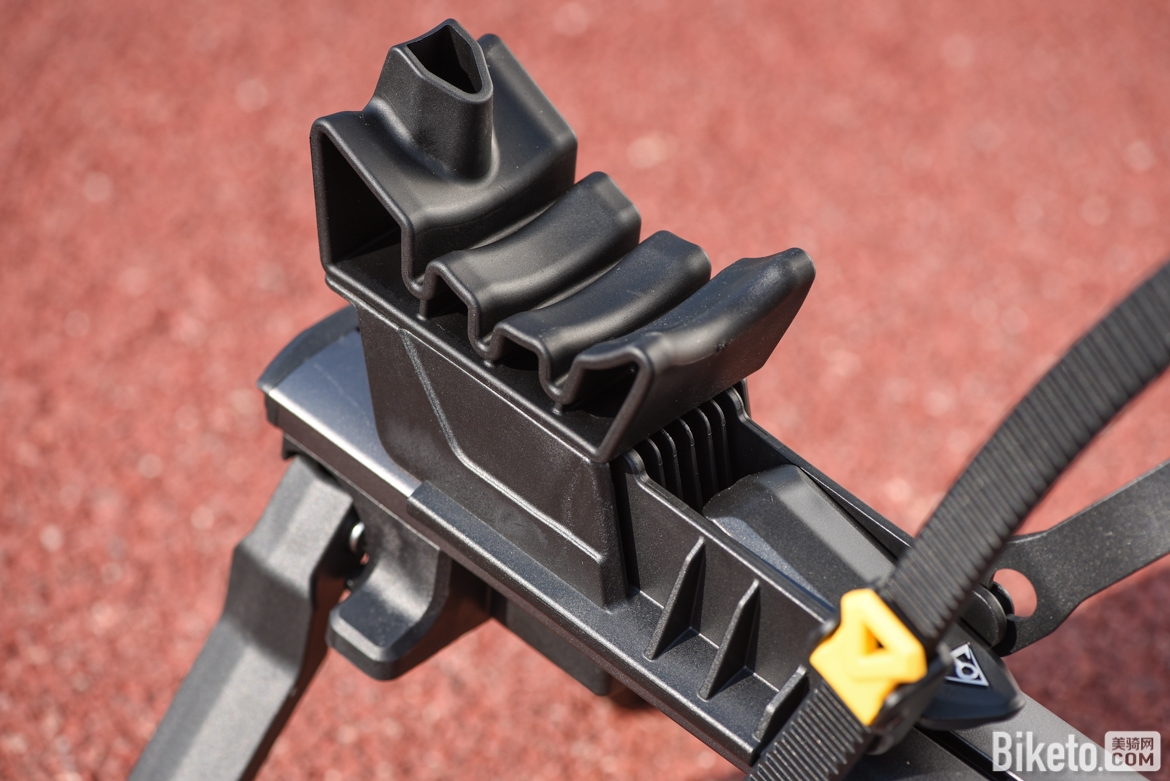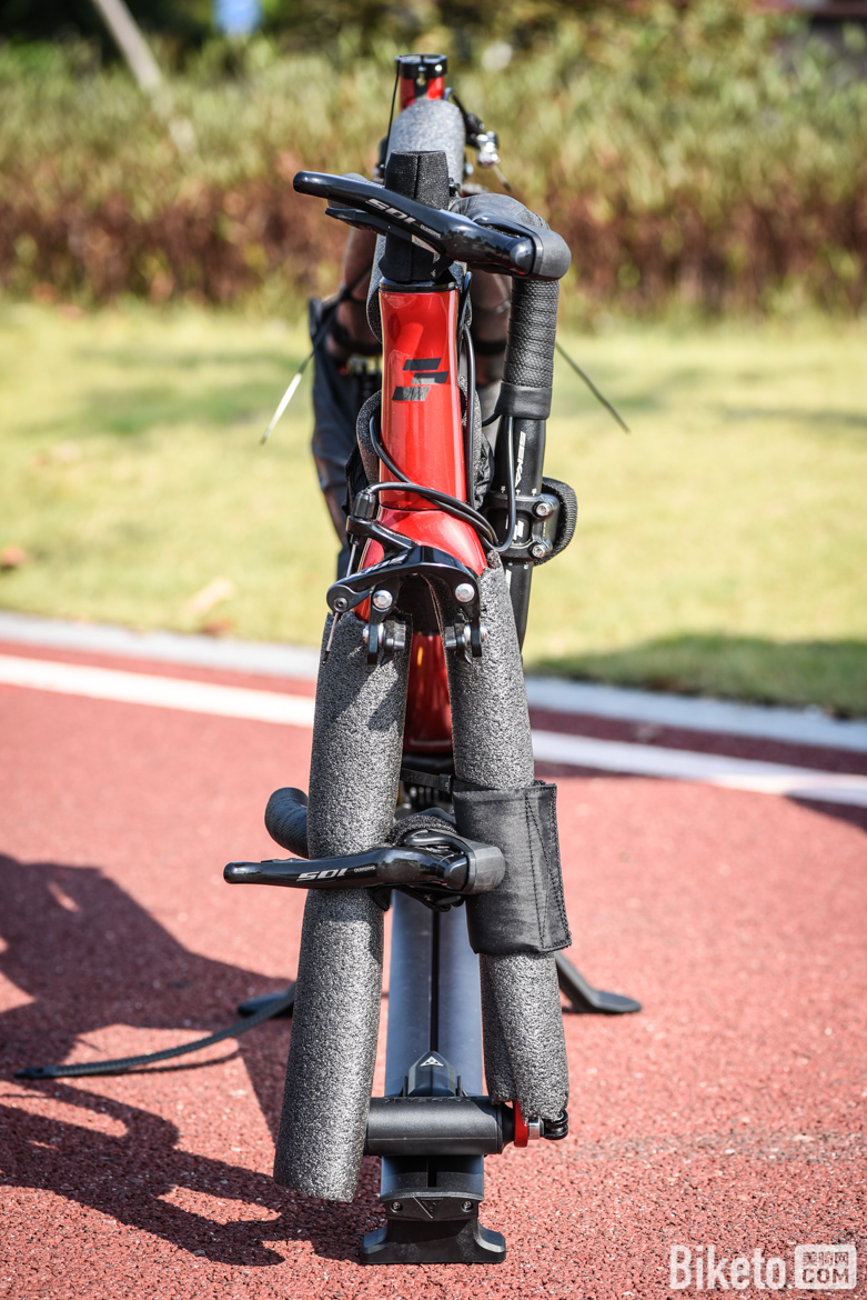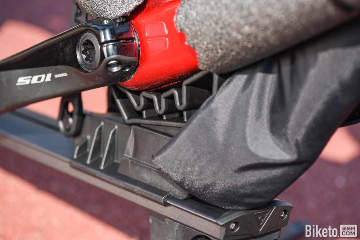 车架组前端使用快拆或者筒轴与底座固定,后端固定位在五通处,使用插扣固定,插扣的长度对目前最为极端的铁三公路车下管来说也是绰绰有余了。