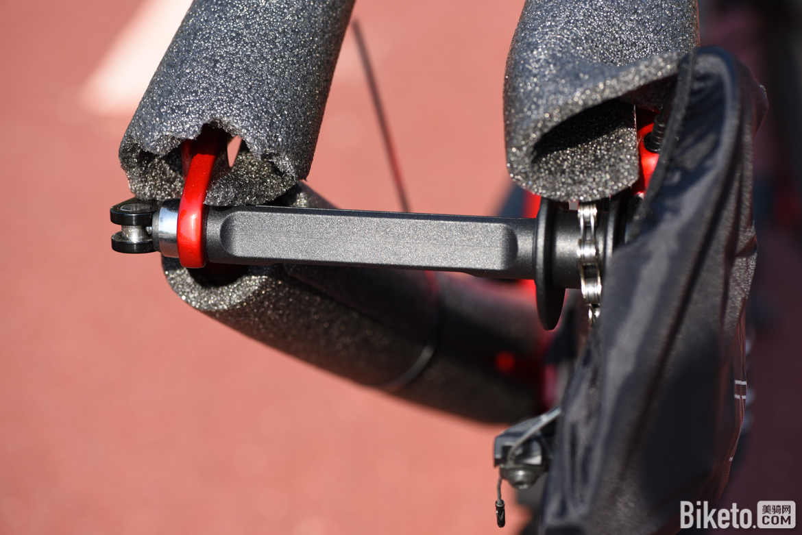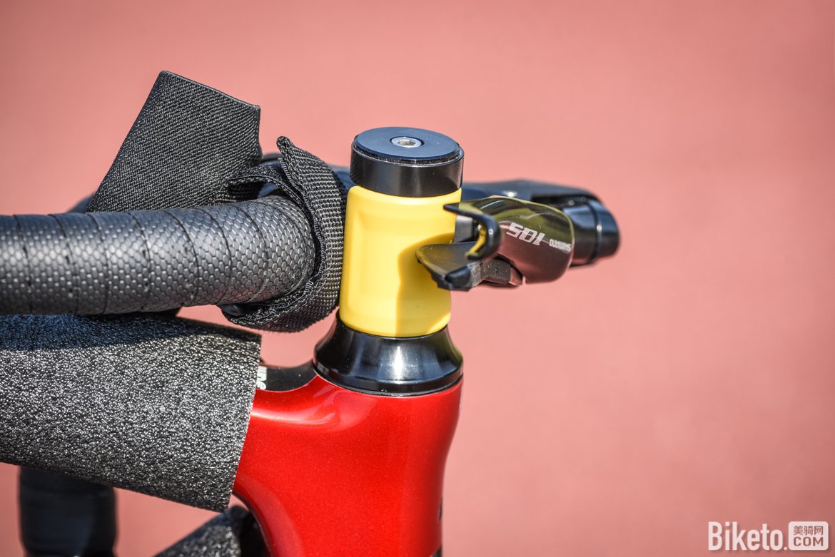 弯把使用了3个单独的魔术贴固定套固定在下管和前叉上,把立盖与碗组中间的空隙则使用TOPEAK提供的黄色卡环固定,防止前叉上下滑动,可谓贴心。