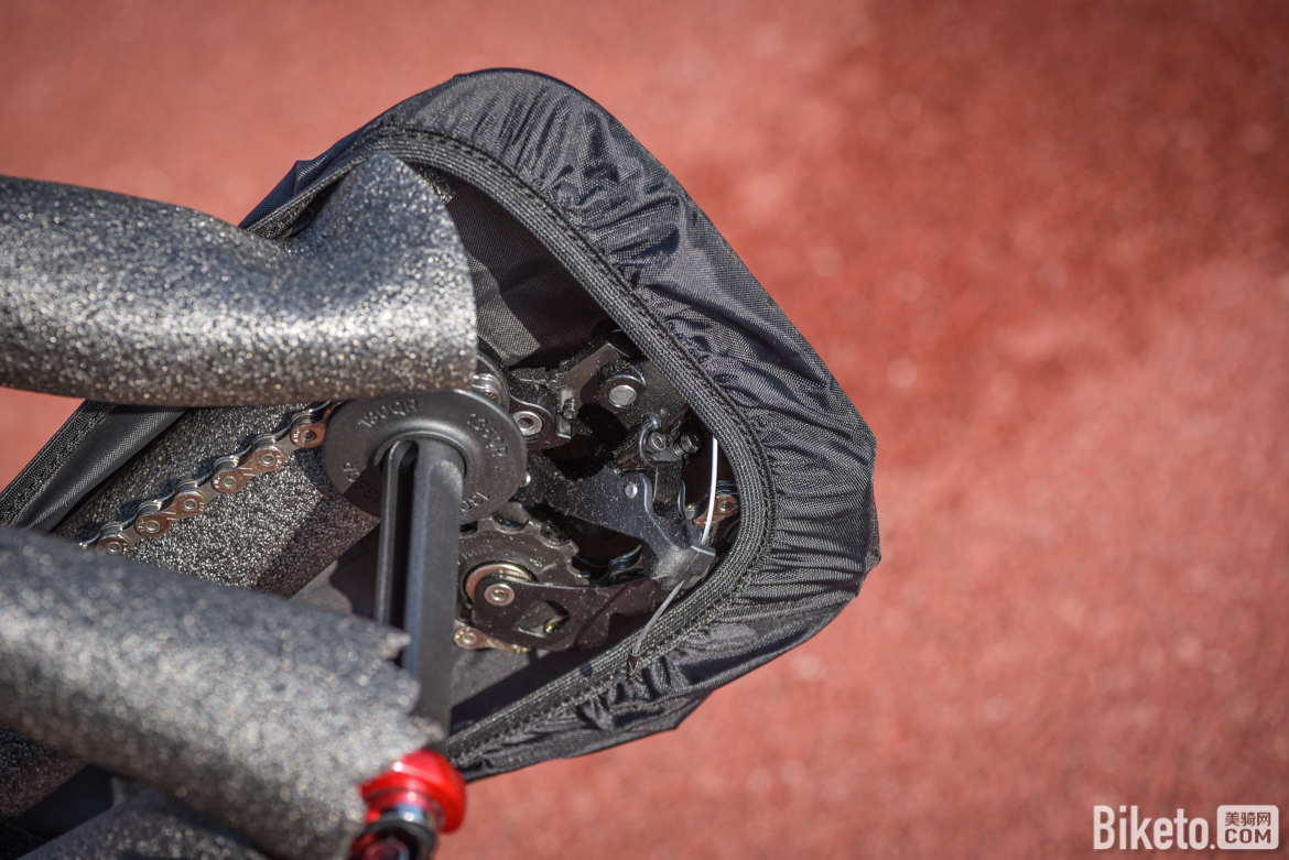 传动系统的保护套跟浴帽一样直接罩上去即可,背面通过魔术贴加强固定,大面积的魔术贴也承担着固定座杆的作用。