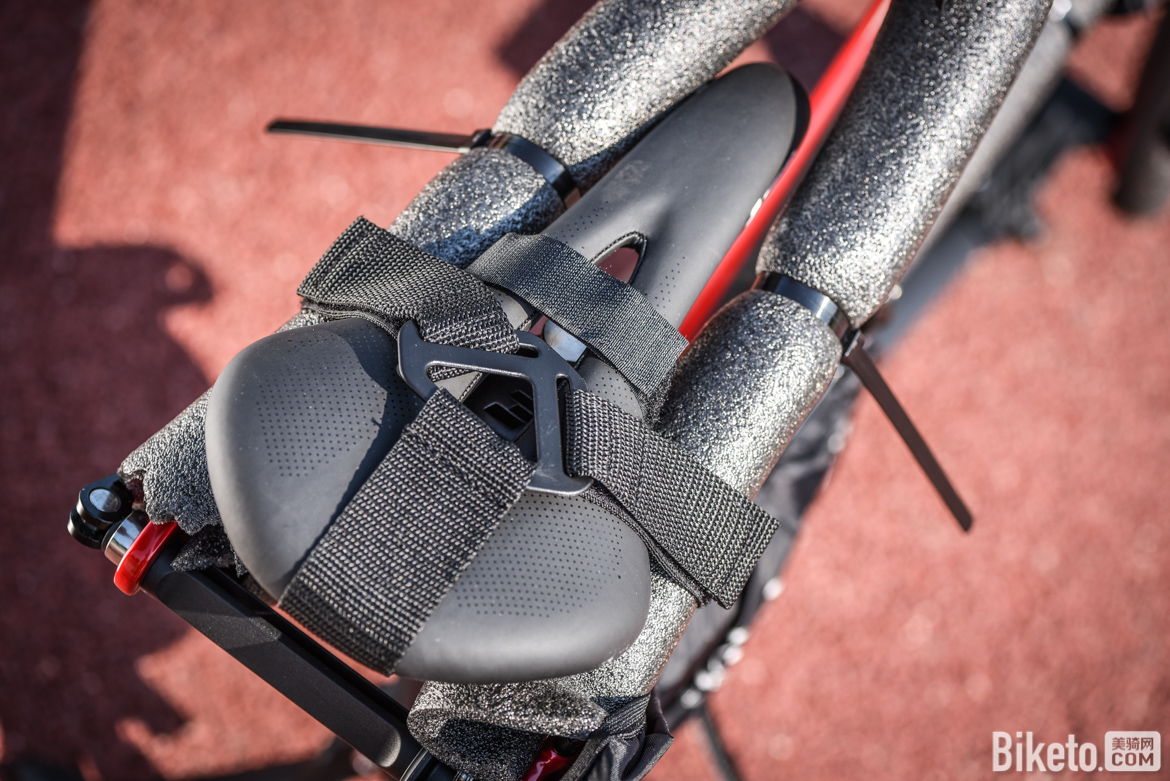 坐垫与座杆套上保护套后存放在后叉开档中间,通过魔术贴3点固定,简直是丧心病狂的稳固!