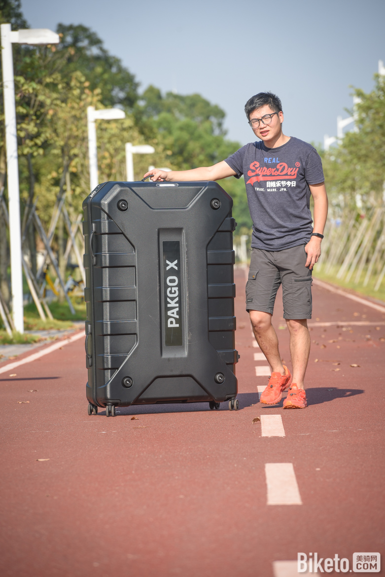TOPEAK PAKGO-X装车箱主体采用PC硬壳材质,标配铝合金固定架;整体的重量为12.8KG(含随行立车架)尺寸为方面长宽高分别为127cm,85cm,35cm。