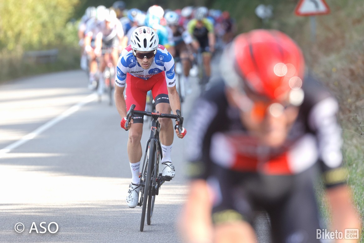 赛段设置越困难,情况越复杂,突围成功的可能就相对越大。沉寂了几天的韦伦斯(乐透-速的奥)可不会放过这样的好机会,他抢到了第一个爬坡点的积分,也带出了一个阵容庞大的突围集团,在开赛40km后共有12人。不过他们的优势很微弱,仅50秒,后方主车群的节奏被科菲迪斯、布尔戈斯两支车队带得极快。前者想要帮助纪尧姆保住圆点衫,后者到目前还未尝一胜,且突围集团里没有任何一个本队的车手。因此双方不会轻易放走前方的几人。