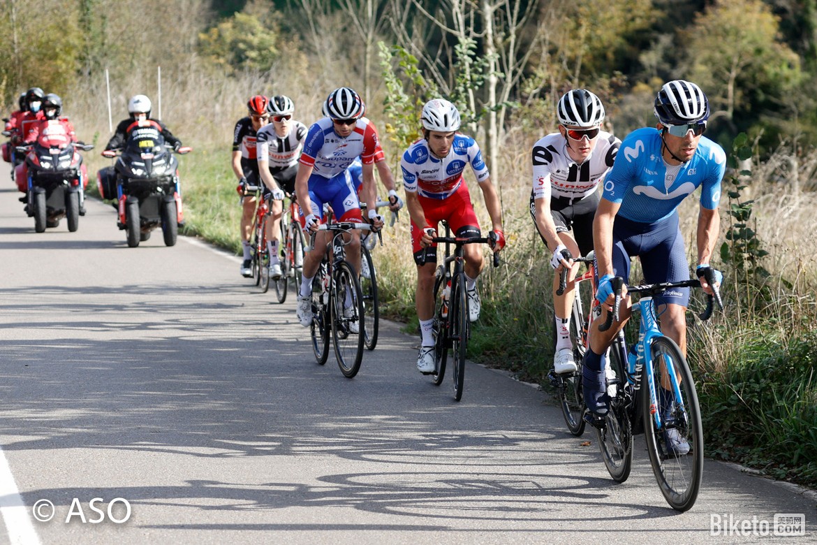 科菲迪斯车队和前方突围车手的拉锯战持续到了本赛段的第二个爬坡,好在科菲迪斯车队的追击很成功,开始爬坡后不久,本就优势不大的突围集团已近在眼前了。期间纪尧姆(科菲迪斯)曾试图加速追上韦伦斯,不想给他更多的爬坡积分。不过很快两个集团便合龙,所有车手都暂时回到了主集团里。而就在这时,阿米拉伊(FDJ)在主车群抵达坡顶前率先发难,瞬间带出了移动之星、太阳网等车队的车手,纪尧姆也看准时机追了上去。经过前面的一番消耗,主车群选择目送他们远去。