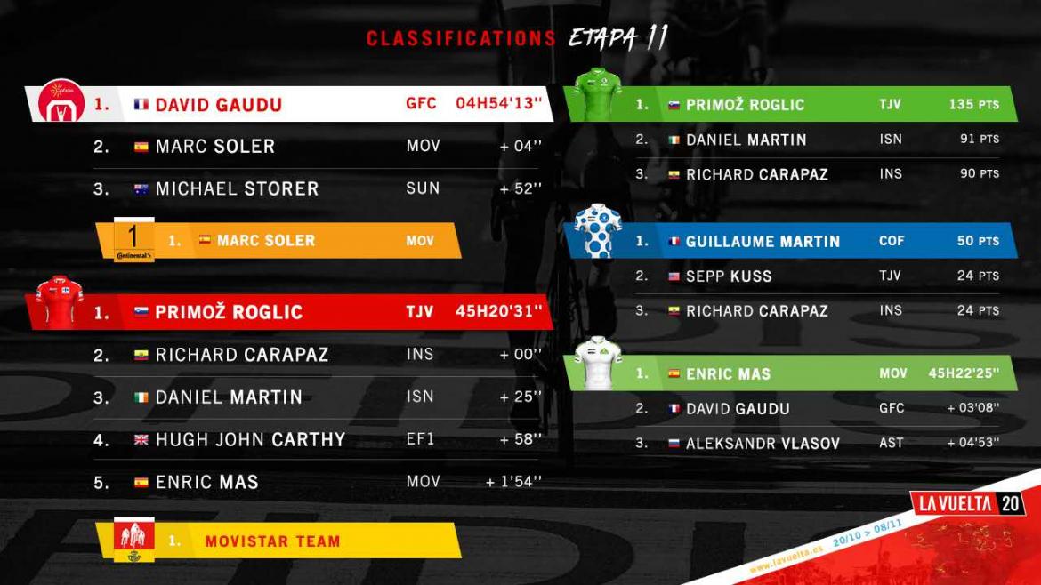 最后5km,索莱尔率先进攻,不过戈迪反应迅速,稳稳地将西班牙人追回。但是领先集团里的其他人体能出现滑坡,索莱尔、戈迪借势继续加速,很快便和后面的几人拉开了30秒左右的差距,并保持到了终点前。到了最后几百米,戈迪率先开冲,索莱尔提防了对手很久,但是这关键的两脚没顶住。戈迪轻松击败对手,终于开胡,收了个人、车队在本届环西的首胜。索莱尔、斯托勒分列二三位。