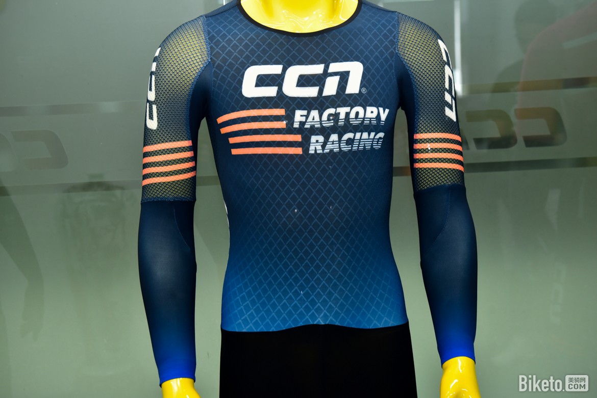 ▲CCN在刚刚结束的中国国际自行车展上展出了新款的TT连体服,使用背拉链和内置号码牌袋(可选单袋和双袋)的极致气动设计,手臂部分大面积的网布也有利于散热