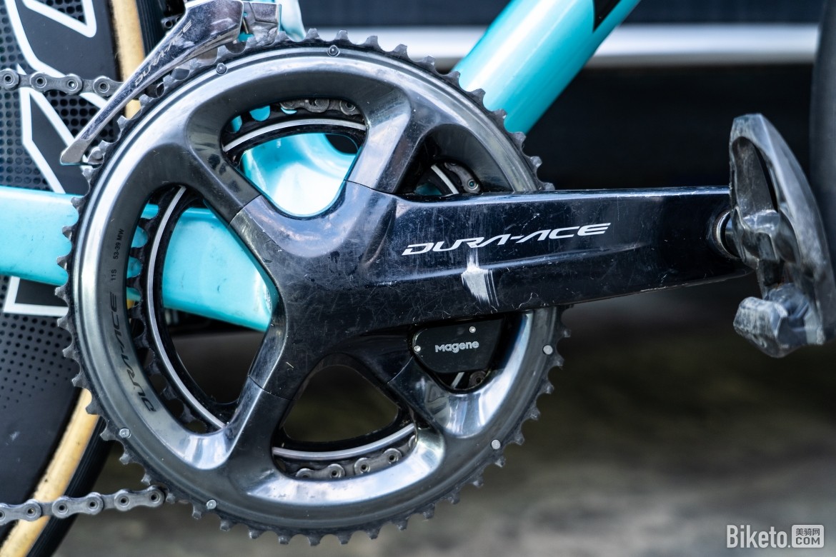 ▲战痕累累的Dura- Ace牙盘与迈金功率计