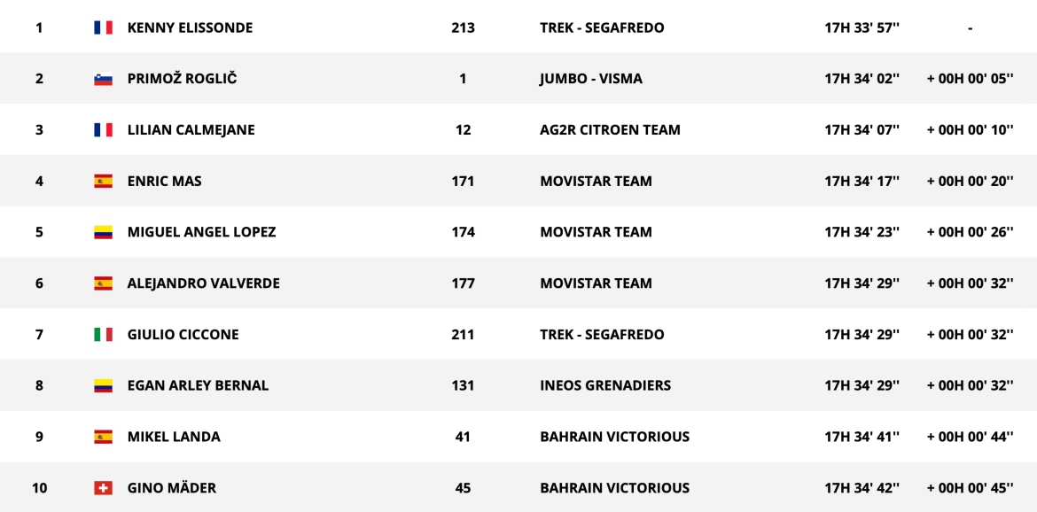 赛段结束后,埃利松德成为新的总成绩红衫拥有者,罗格里奇的总成绩落后5秒位居第二。菲利普森从雅各布森手中夺回了冲刺绿衫,塔拉麦保有爬坡圆点衫,贝纳尔继续身穿最佳年轻车手白衫。