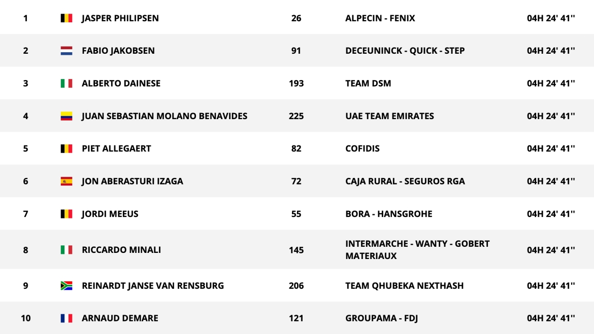 欧倍青-菲尼克斯车队以完美的火车阵型将菲利普森送入最后1km,FDJ车队乱了阵脚,德马尔被车流吞没,雅各布森位置不佳,独自奋力往前追赶,只有菲利普森如离弦之箭一般发射了出去。最终菲利普森成功夺得自己在本届环西的第二场赛段胜利,雅各布森屈居第二,达伊内塞第三。