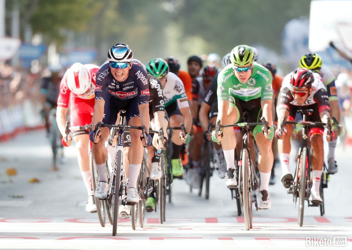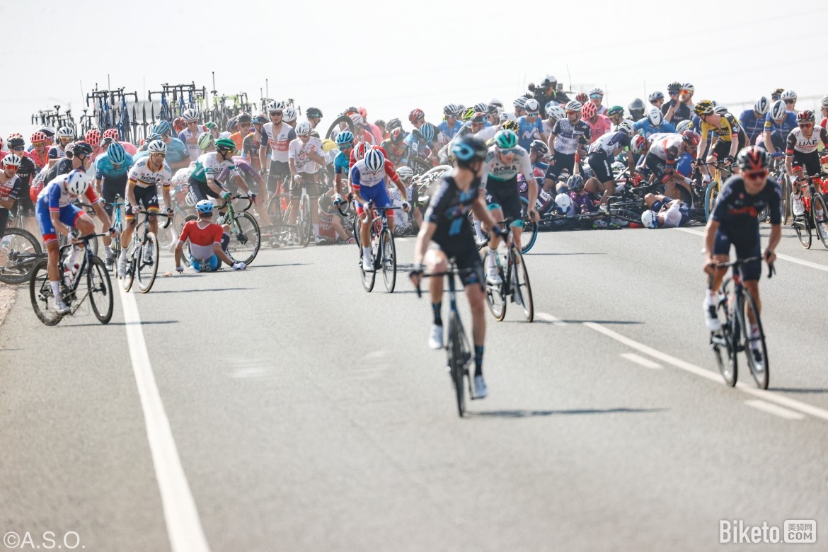 但就在距离终点11km时,主集团中部发生了一场大规模摔车事故,大量车手倒地,比赛节奏被打断,未受摔车波及的车手们暂时放缓脚步,等待着队友的归来。不过终点已经很近了,主集团并不会一直等待掉队车手,在最后5km缓慢提速,身穿红衫的塔拉麦在后方苦苦追赶,欧倍青-菲尼克斯等车队则带着主集团高速进入最后2km。