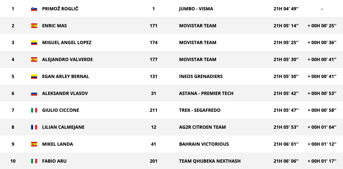 赛段结束后,罗格里奇领先马斯25秒再登总成绩榜首,穿上了领骑红衫。菲利普森领衔冲刺绿衫,塔拉麦保有爬坡圆点衫,贝纳尔继续身穿最佳年轻车手白衫。
