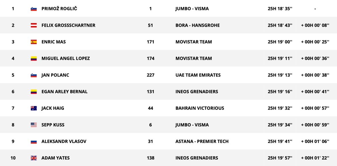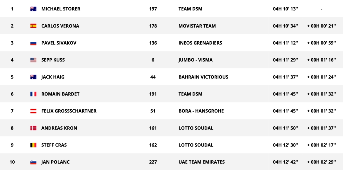 赛段结束后,罗格里奇(珍宝-维斯马)继续身居总成绩榜首,领先第二名格罗斯沙特纳(博拉-汉斯格雅)8秒,保有总成绩红衫。菲利普森(欧倍青-菲尼克斯)领衔冲刺绿衫,西瓦科夫(英力士)从塔拉麦(旺蒂)手中夺得爬坡圆点衫,贝纳尔继续身穿最佳年轻车手白衫。