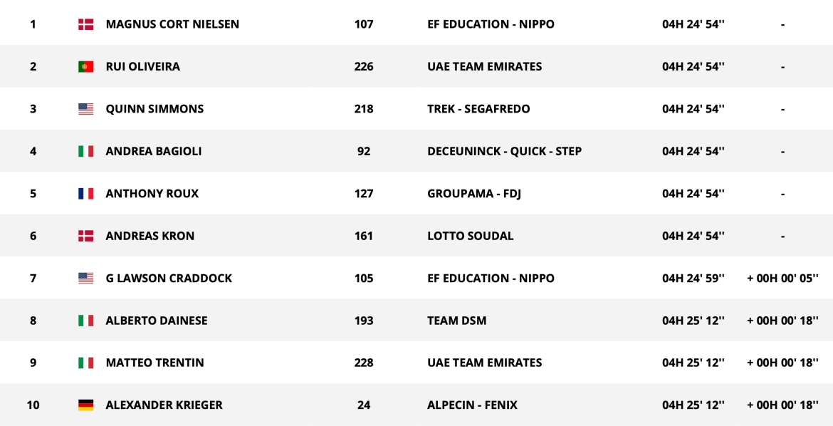 尽管主车群前方的领骑车队不断地轮替,但是突围集团仍牢牢地将30秒左右的优势守了近30km,直到终点。最终,英孚教育车队拿到了他们在本届环西赛场上的第三胜,科特上演帽子戏法,奥利维拉和西蒙斯功亏一篑,分列二、三名。
