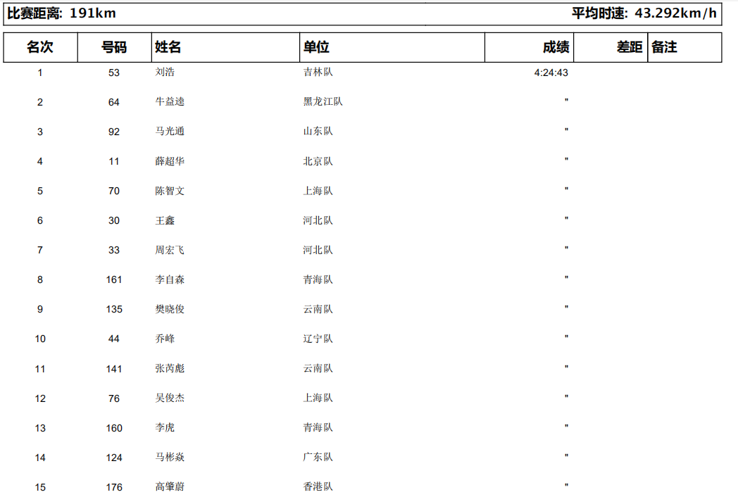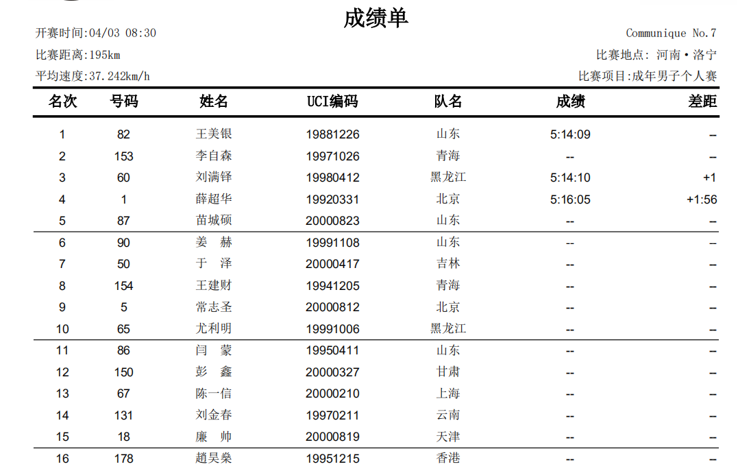 第三场:最后5公里,内蒙古的郝然试图单飞,但被黑龙江火车在终点前2公里处追回。最终迎来大集团冲刺,吉林队的刘浩夺冠,黑龙江的牛益逵和山东的马光通获得二三名。