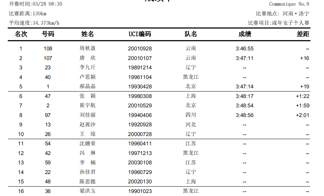 全运会个人赛女子组的比赛路线与男子组基本相同:骑行至莽岭绿道入口后需折返沙河子桥1圈,共计128公里。本次参赛选手根据前三场个人赛(洛宁两站、商洛站)排名,取前70名选手参赛,每队最多6人参加,部分参赛队由于积分不足,出现3-5人参赛的情形。