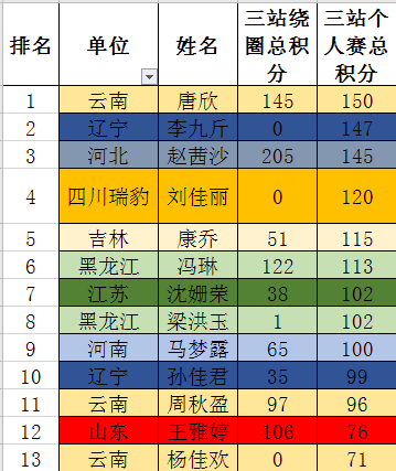 结合总积分图,把累计积分在100分以下的选手筛除。女子组队伍之间实力相比较男子组差距更大,结合去年迁西赛战绩,四场比赛中的三场均由突围小队站台,仅有最近一场为大集团冲刺对决。而且这四场取胜且排名靠前的选手,绕圈赛积分排名集中在前10名,如果累计积分不足100分,冲击领奖台就是奢望。符合条件的选手共9人,名单如下: