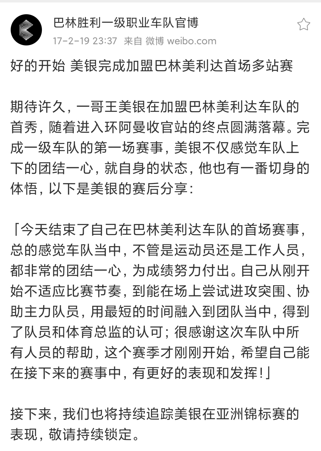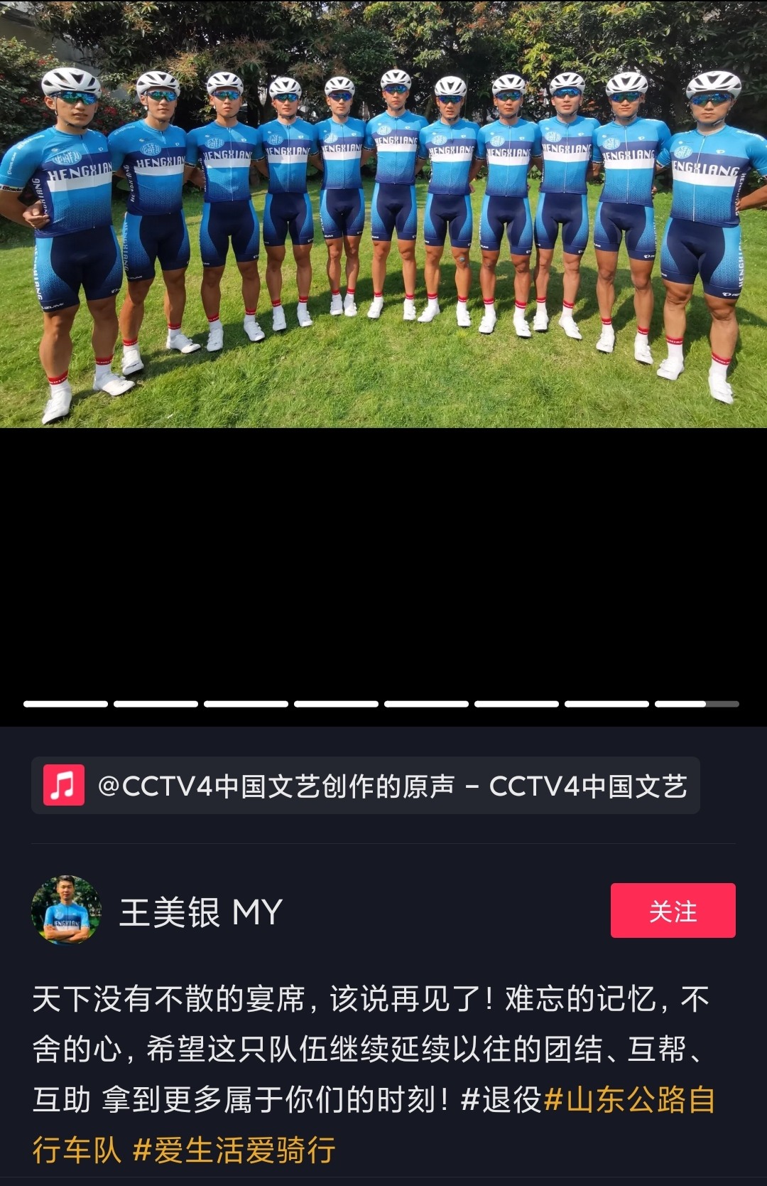 后记:难说再见。2022年2月22日夜,王美银在个人社交平台发布退役消息:“天下没有不散的宴席,该说再见了!难忘的记忆,不舍的心,希望这支队伍继续延续以往的团结、互帮、互助。拿到更多属于你们的时刻!#退役#山东公路自行车队。”从那个15岁的追风少年,再到闪耀兰卡威,再到巴林-美利达,最后在老东家谢幕。王美银的职业生涯令人动容,期待正在崛起00后现役车手以王美银为榜样,脚踏实地在省队、在国内洲际队立足发展,才能一步步实现最初的梦想。
