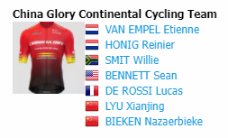 China Glory华兴车队在本届环土耳其自行车赛将派出7名车手参加,其中包括两名中国车手吕先景和那扎尔别克·别肯,此外还有艾蒂安·范恩佩尔、雷奈尔·翁尼、维利·斯密特、肖恩·本内特、卢卡斯·德罗西。