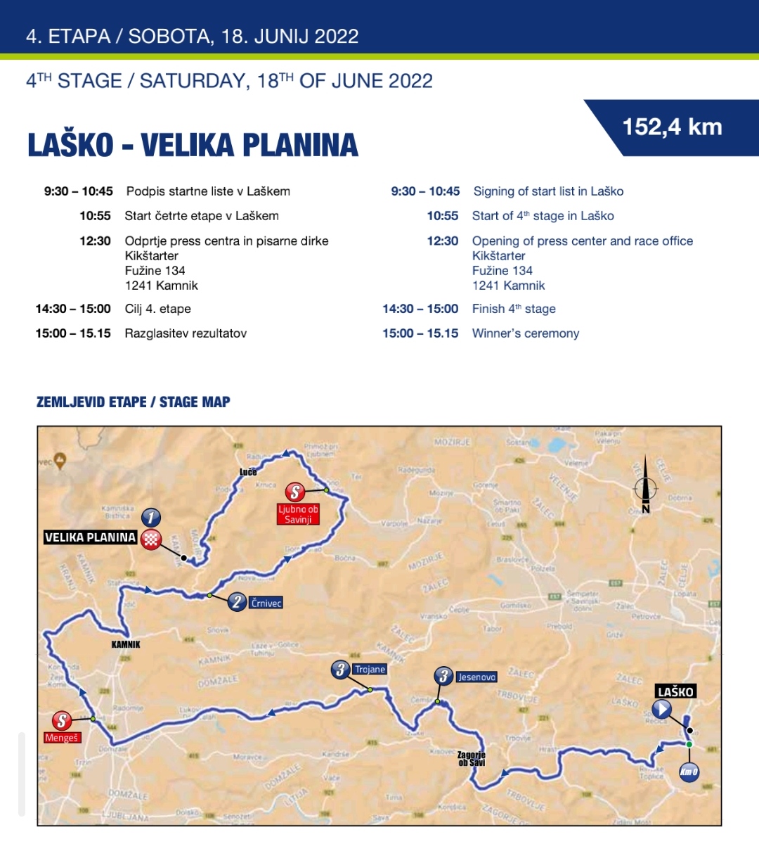 本场赛程152.5公里,从拉什科前往维利卡普拉尼那,终点为高地地带,是斯洛文尼亚雪景胜地。比赛看点发生在(Crnivec)科尼维山(108.7公里处,5.7%的2级坡)和终点(Velika planina)维利卡普拉尼那高地(152公里处,7.6%的1级坡),部分爬坡能力强的选手从科尼维山下山后,会再次借助约20公里缓上坡和已经断龙的大集团拉开差距,这些车手也会分化出多股突围小队,最后在维利卡普拉尼那高地(平均坡度8.9%)一决雌雄,获胜的车手基本坐稳赛事总冠军。