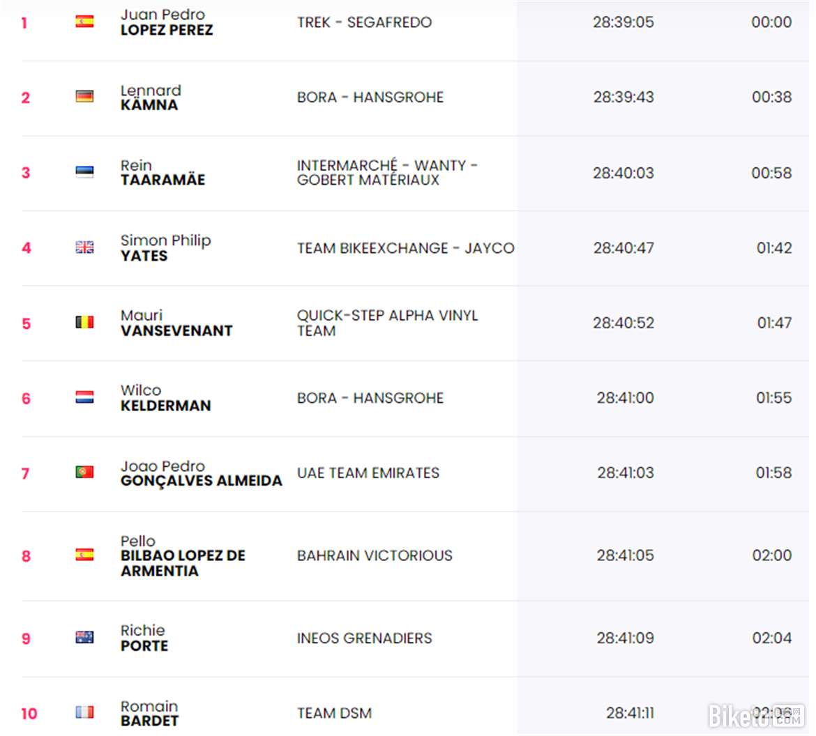 主车群落后2分59秒过线,巴林胜利尝试开出冲刺火车,但主将状态一般。伦纳德·凯姆纳(博拉-汉斯格雅)拼下主车群头名,胡安·洛佩兹保住粉衫、总成绩车手没有拉开秒差。