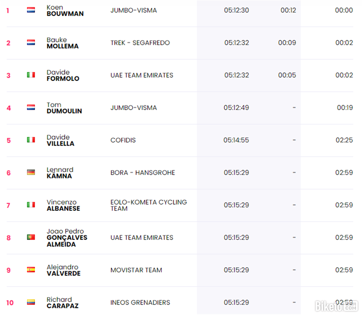 汤姆·迪穆兰带着四人进入最后1公里,福尔莫罗、鲍曼、莫莱马依次排位。最后350米有平均坡度8%的陡坡,在迪穆兰带冲下,科恩·鲍曼成功发射砍下单站冠军!鲍克·莫莱马与大卫·福尔莫罗分列二三。