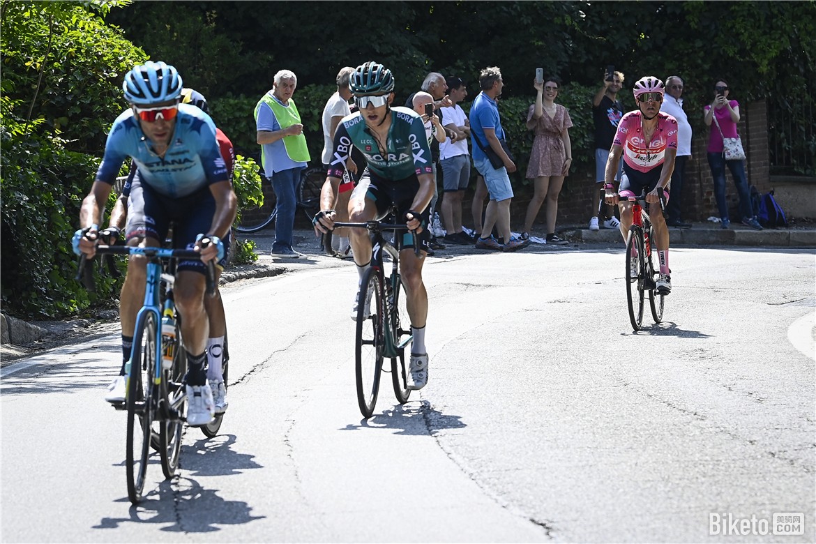 距终点15公里,追击集团文森佐·尼巴利发动进攻,带出了贾伊·欣德利。布赫曼的位置将其他车手稍有断龙,第三集团重新组织追击。700米后,欣德利尝试提速,尼巴利则稍有掉队。再过300米,欣德利成功追上了卡拉帕兹。随着欣德利不参与轮转,尼巴利与更身后追击的西蒙·耶茨重新追回,四人大踏步向前。二级坡坡顶,阿尔梅达与波佐维沃二人组成追击集团,时间差为15秒。